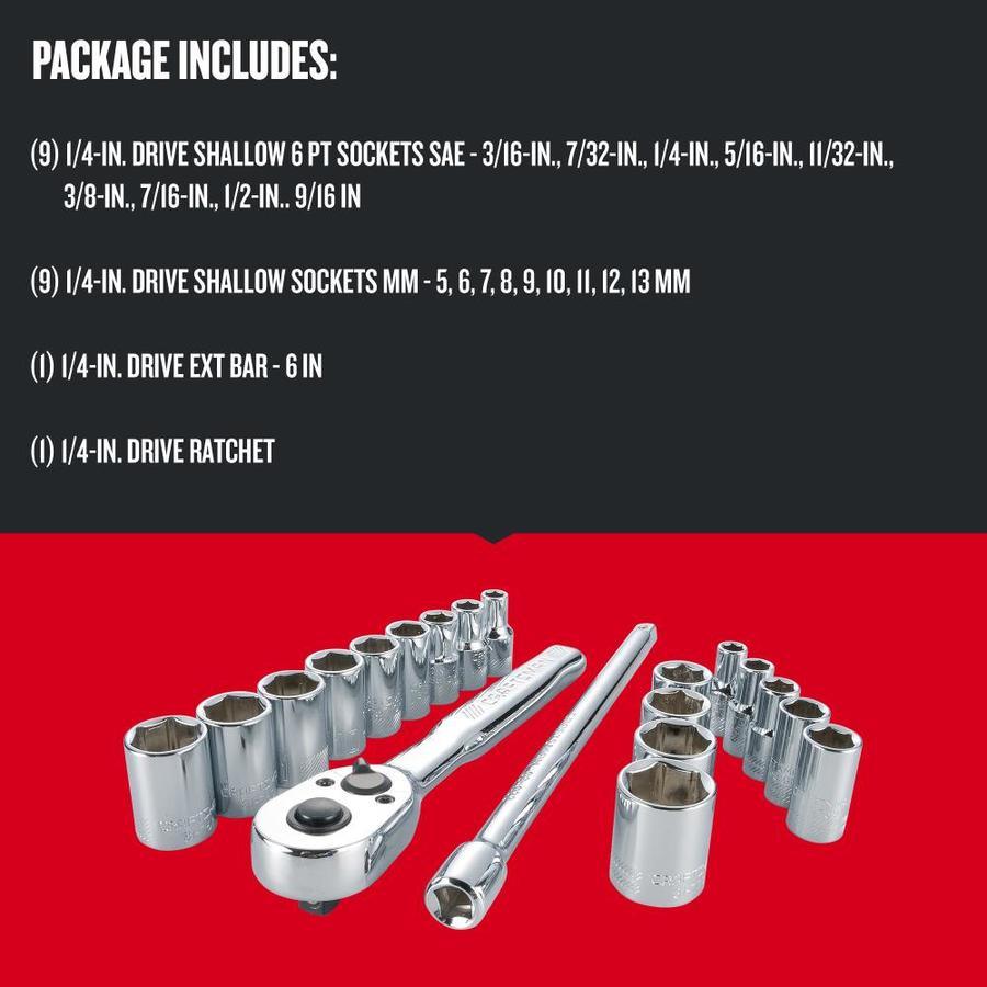 Compatible with the versa stack™ portable storage system Corrosion resistance: full polish chrome finish Minimal arc swing: 72 tooth ratchets Increased torque: 6 point socket with fastener Mobility and durability: compact storage case Quick size identification: large markings Meets or exceeds ASME specifications Common applications include automotive mechanical and home repair Includes (9) 1/4-in drive shallow 6 PT sockets SAE (3/16,7/32,1/4,5/16,11/32,3/8,7/16,1/2,9/16-in), (9) 1/4-in drive shallow 6 PT sockets metric (5,6,7,8,9,10,11,12,13mm), (1) 1/4-in drive pear head ratchet and (1) 1/4-in drive extension (6-in)