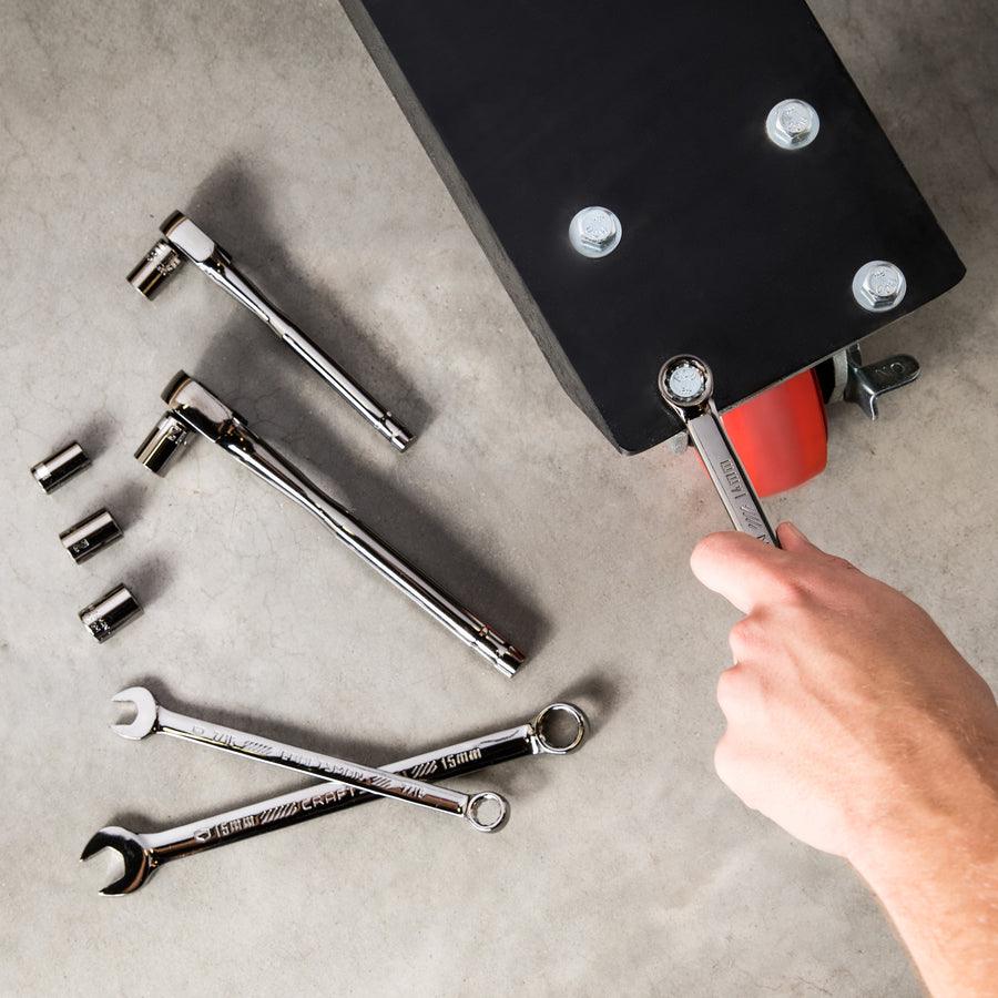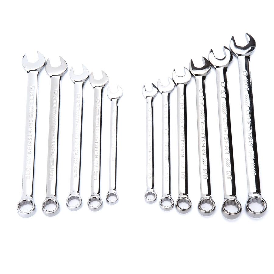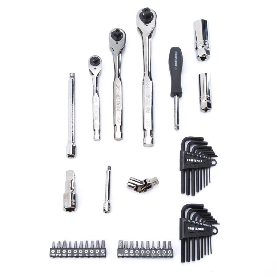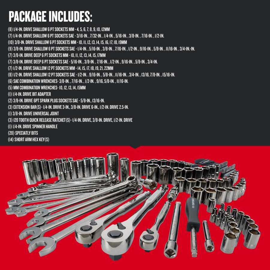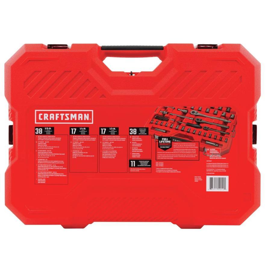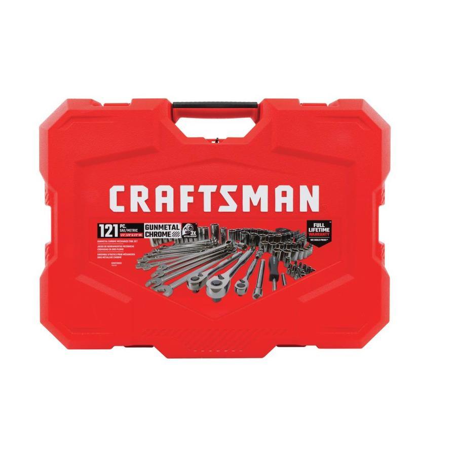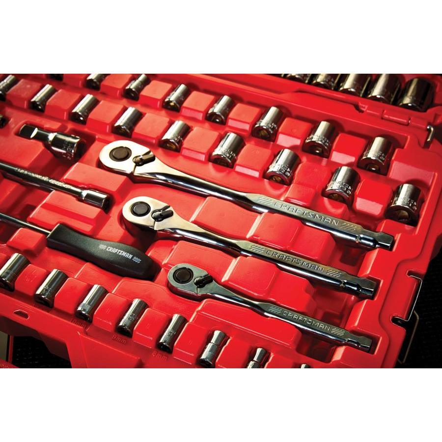 SUPERIOR RUST RESISTANCE: Gun Metal Chrome INCREASED ACCESS: 120 Tooth Ratchets and Minimal Arc Swing 7X GRIPPING POWER: Anti-Slip Wrenches INCREASED TORQUE: 6 Point Socket with fastener QUICK SIZE IDENTIFICATION: Large Markings EASY TOOL STORAGE: Durable Blow Molded Case Meets or Exceeds ASME Specifications Common applications include automotive mechanical and home repair CRAFTSMAN Full Lifetime Warranty