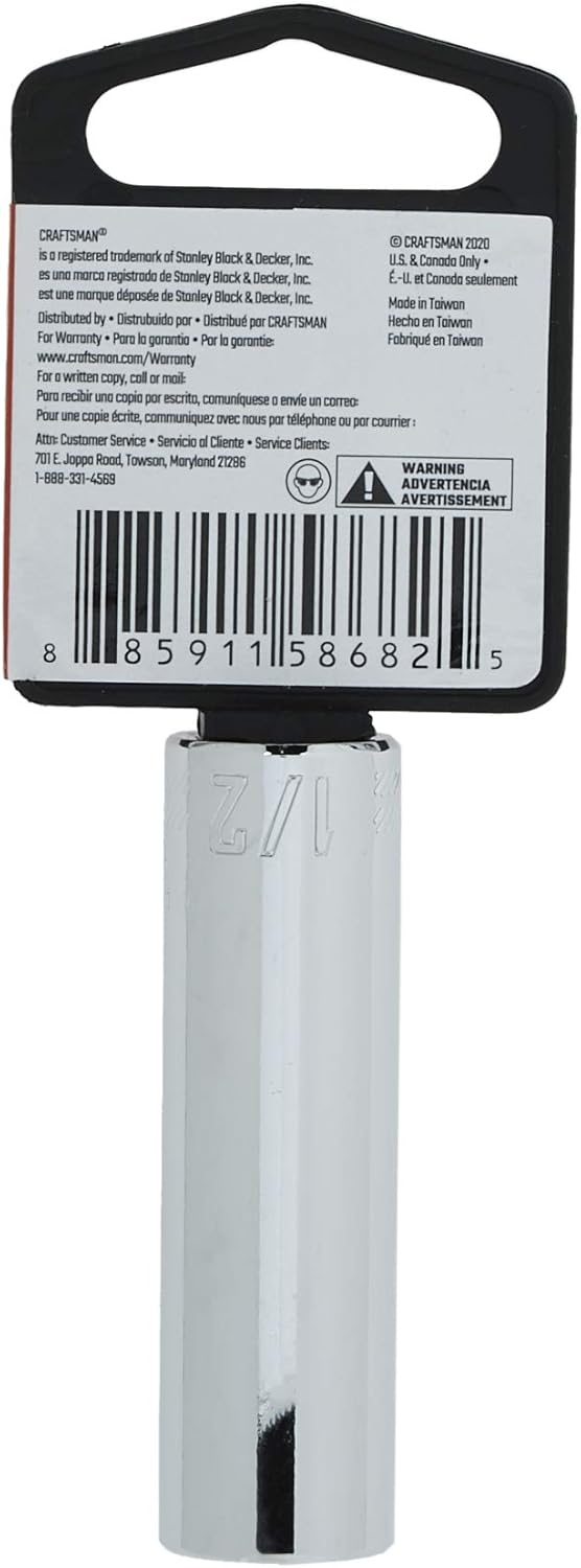 This Craftsman deep socket features a 1/2-inch SAE size with a 3/8-inch drive for versatile automotive and household fastening. The 6-point design grips fastener flats to reduce rounding, and the full-polish chrome finish resists corrosion for long-lasting performance.
