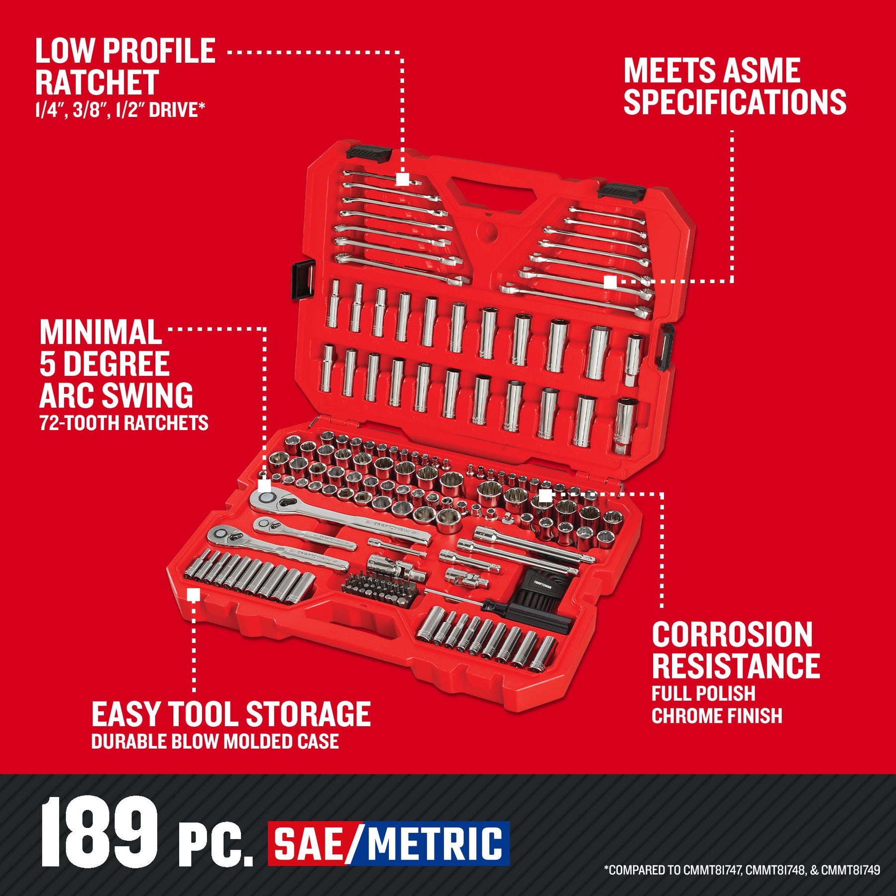 CRAFTSMAN 189-Piece SAE/Metric Mechanics Tool Set with 72-Tooth Ratchets & Hard Case, Polished Chrome