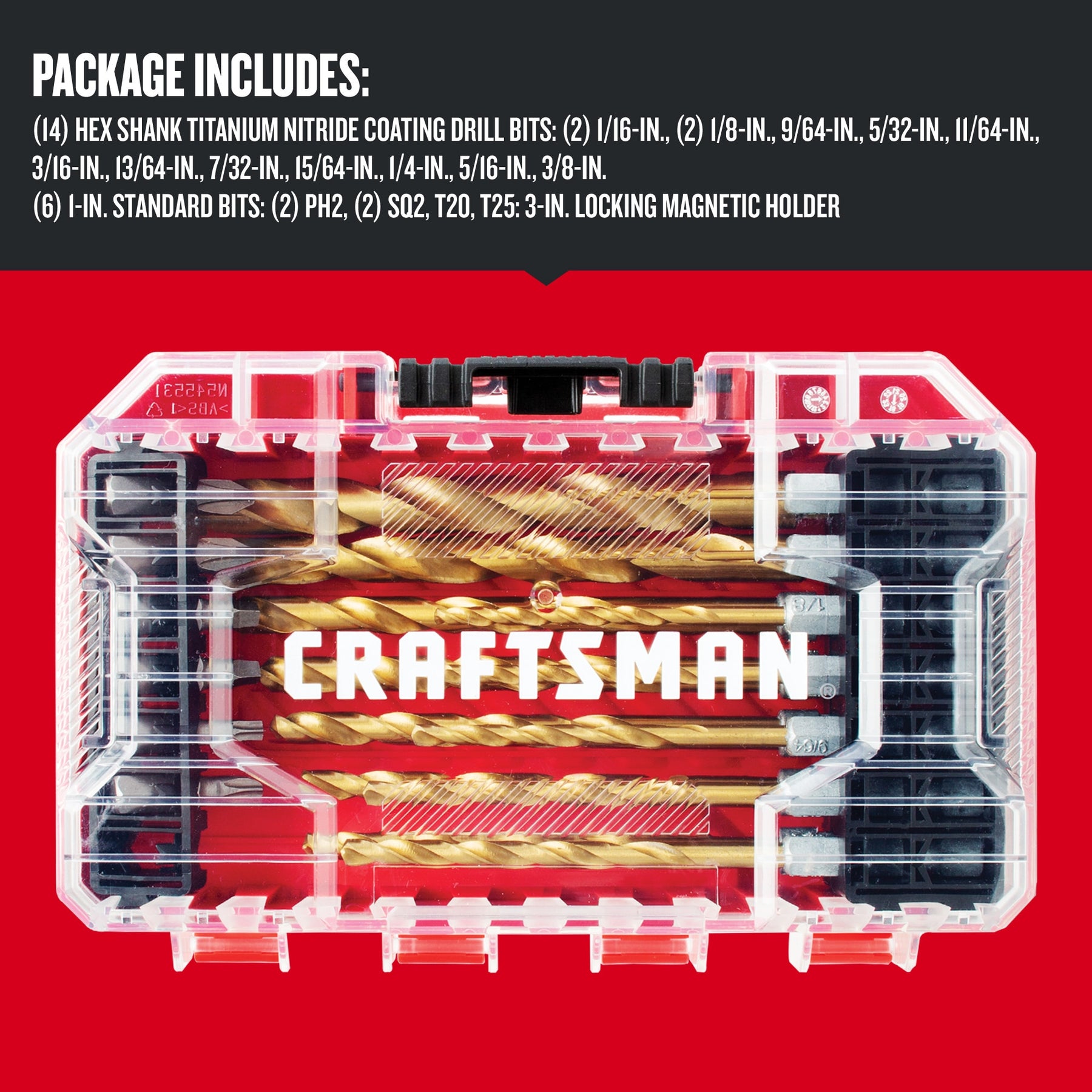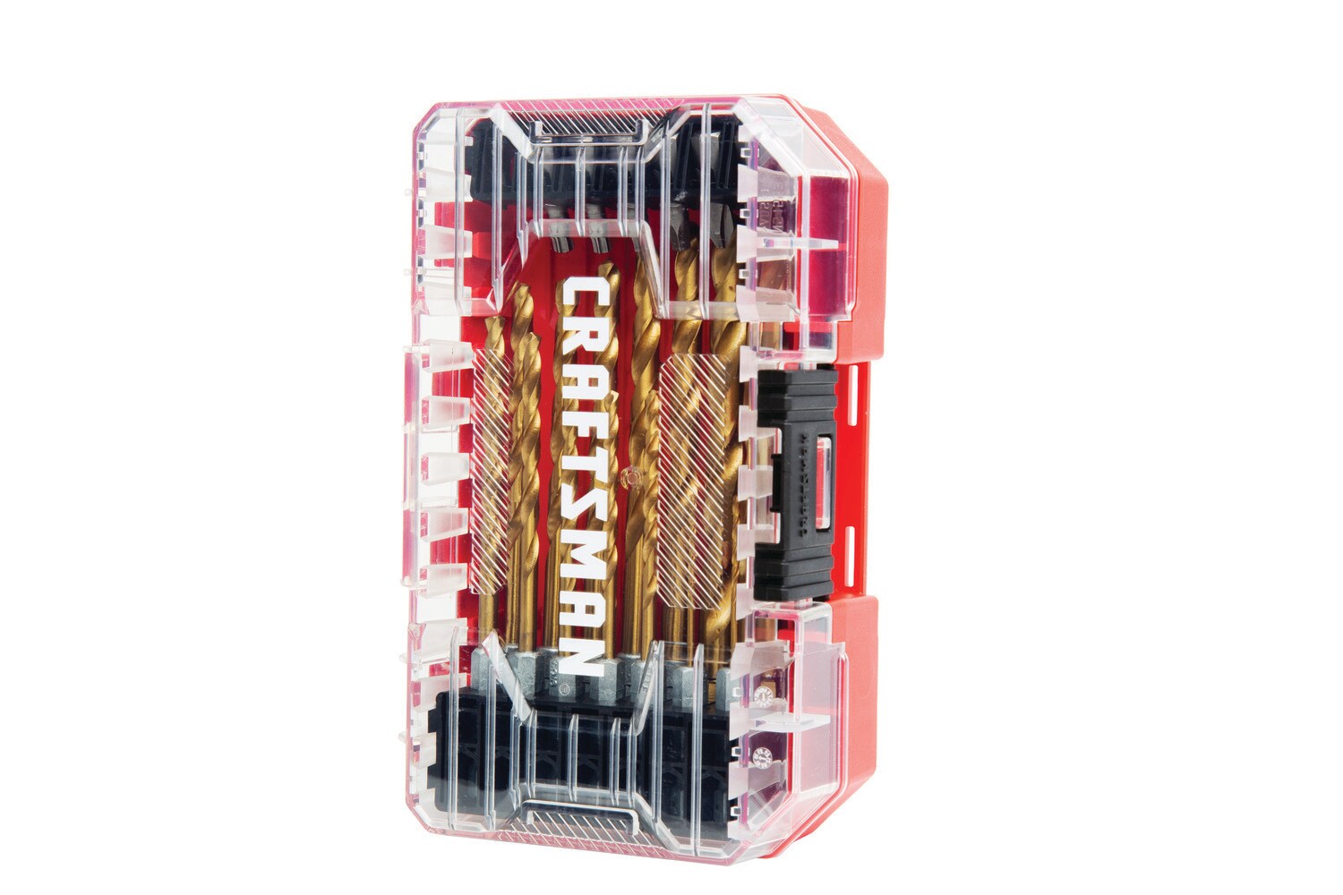 This CRAFTSMAN 21-piece set pairs titanium nitride coated HSS drill bits with impact-ready hex shanks and key screwdriving bits, all housed in a compact case. Designed for clean, burr-free holes and durable performance in wood, plastic, PVC, and medium-gauge metal.