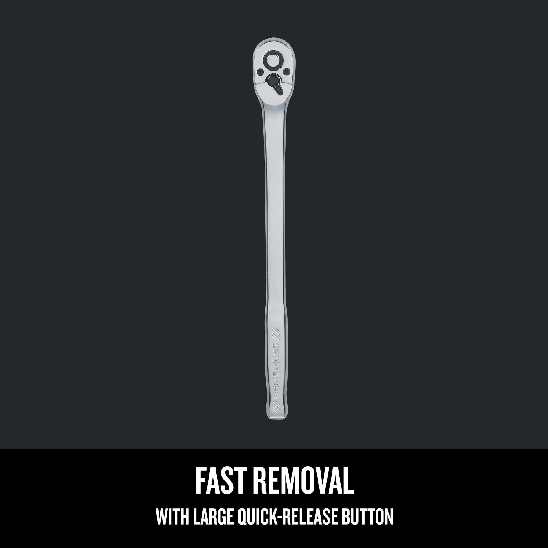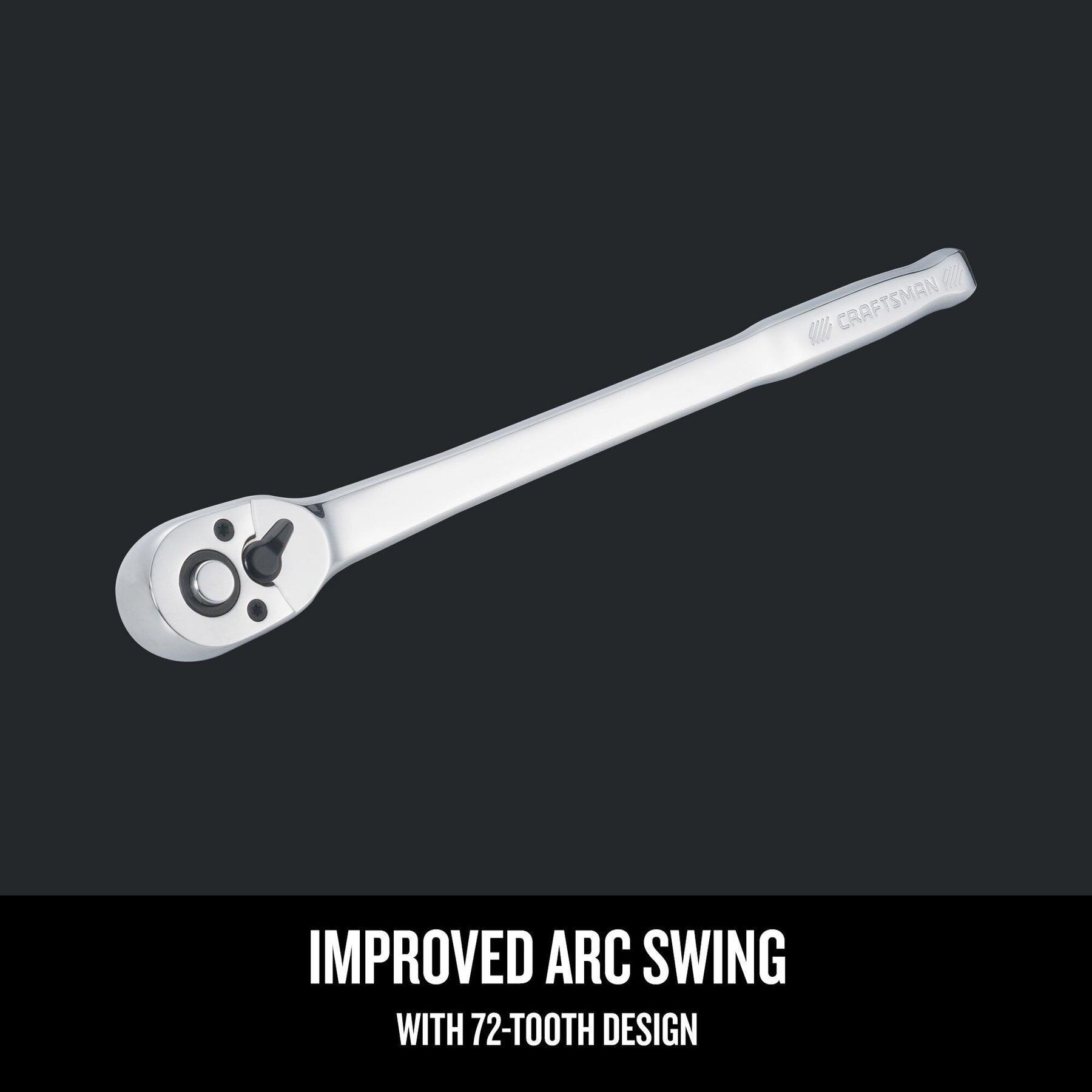 A full-polish CRAFTSMAN 3/8-in drive ratchet with a 72-tooth mechanism for a tight 5° arc swing. Features an extra-long, ergonomic handle and large quick-release button for fast socket changes and improved reach.