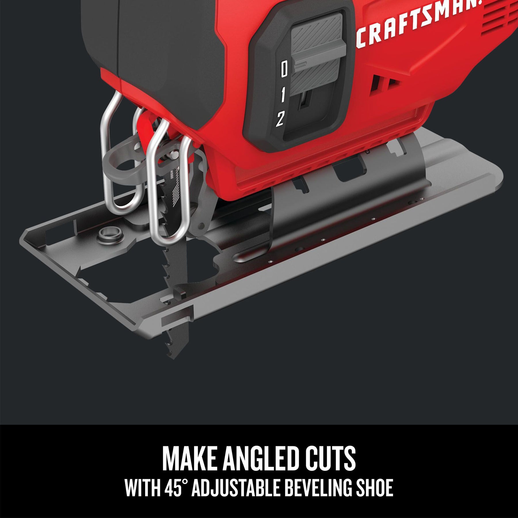This CRAFTSMAN V20 cordless jigsaw delivers clean, controlled cuts across a range of materials. A variable-speed trigger up to 2,500 SPM, 3 orbital settings, and a 45° beveling shoe provide precision and versatility, while the keyless blade change and integrated dust blower streamline use.