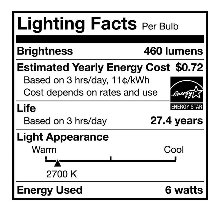 • Energy used: 6-Watt (equivalent to a 40-Watt standard incandescent light bulb)