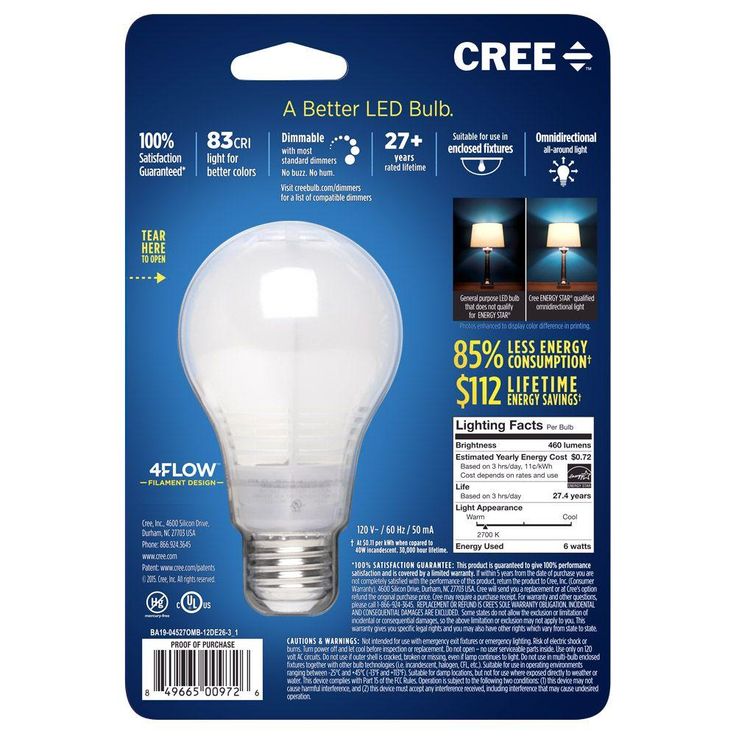 • Uses 85% less energy compared to a standard incandescent light bulb