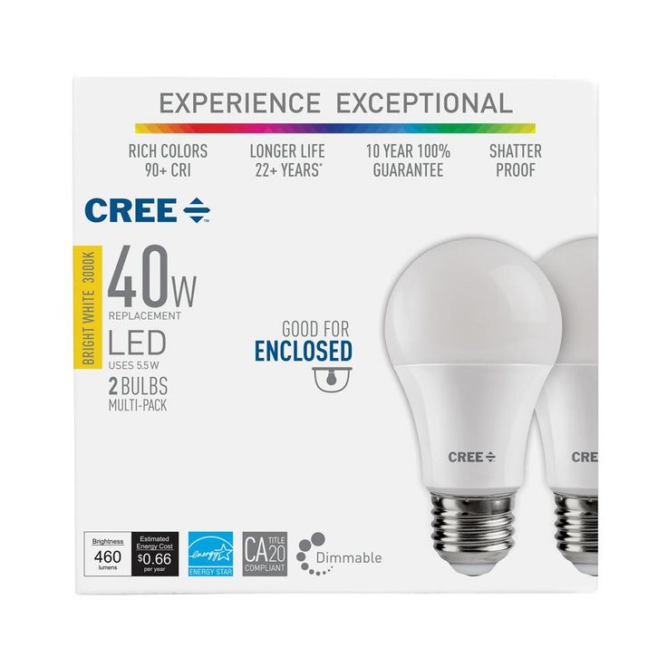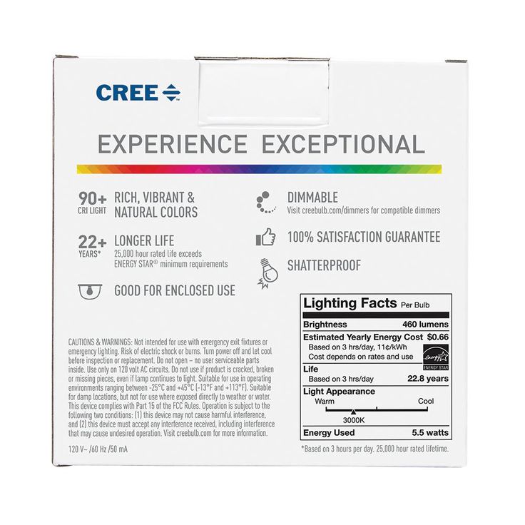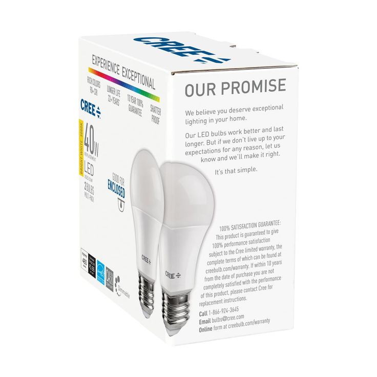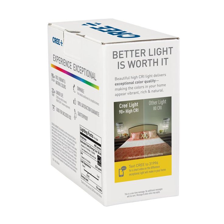We believe you deserve to experience exceptional lighting in your home. That’s why Cree LED bulbs are engineered to work better and last longer. Cree LED bulbs feature beautiful light that provides exceptional color quality (90+ CRI) - making the colors in your home appear vibrant, rich and natural. Designed to last more than 22-year (25,000-hour), Cree LED bulbs are dimmable, suitable for use in fully enclosed fixtures and backed by a worry-free 100% performance satisfaction guarantee. Because when a light bulb is designed to be in your home for decades, an exceptional experience is worth it.