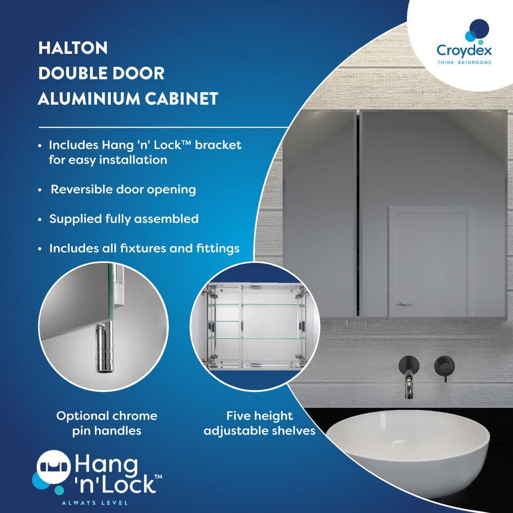 Enhance your bathroom with the Croydex Frameless Aluminum Medicine Cabinet, offering both beauty and practicality. Featuring a sleek design with double-sided mirrored doors, this cabinet integrates the innovative Hang 'N' Lock system for effortless installation. It provides flexible mounting options and ample storage with adjustable glass shelves.