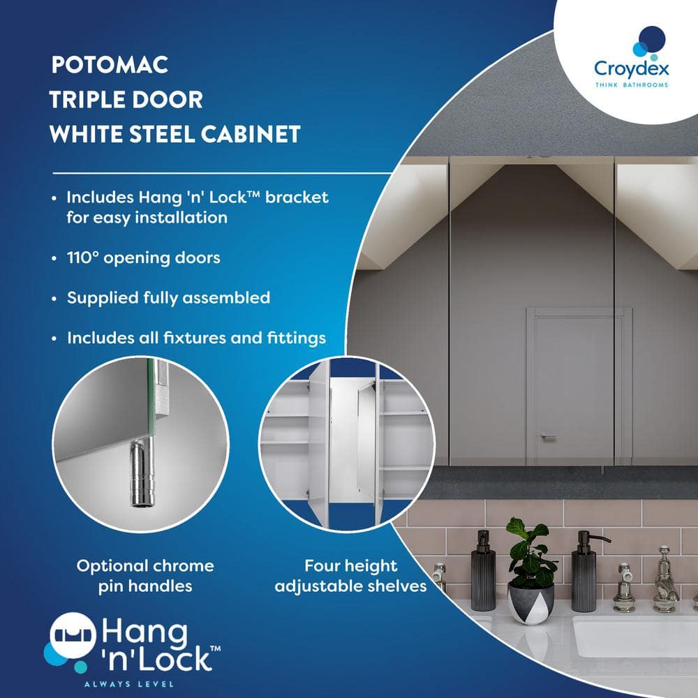 The Croydex Potomac Triple Door Medicine Cabinet combines elegance and convenience with a robust white steel construction and expansive mirrored surfaces. Featuring self-closing hinges and customizable shelving, this cabinet integrates seamlessly into any bathroom, providing ample storage and ease of access. Enhance your bathroom decor with its stylish design and enjoy hassle-free installation using the Hang 'N' Lock bracket.