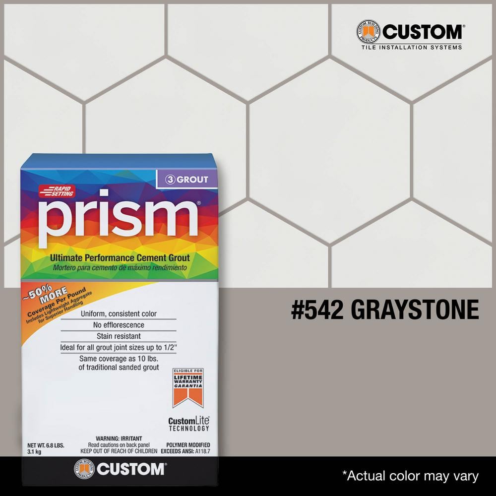 Prism #542 Graystone Ultimate Performance Grout by Custom Building Products delivers an unmatched combination of consistency and strength. This high-performance grout boasts a calcium aluminate formula with no efflorescence, ensuring smooth application and a vibrant, uniform color. Effortlessly tackle any tiling project with a sustainable blend that's 32% lighter for improved handling.