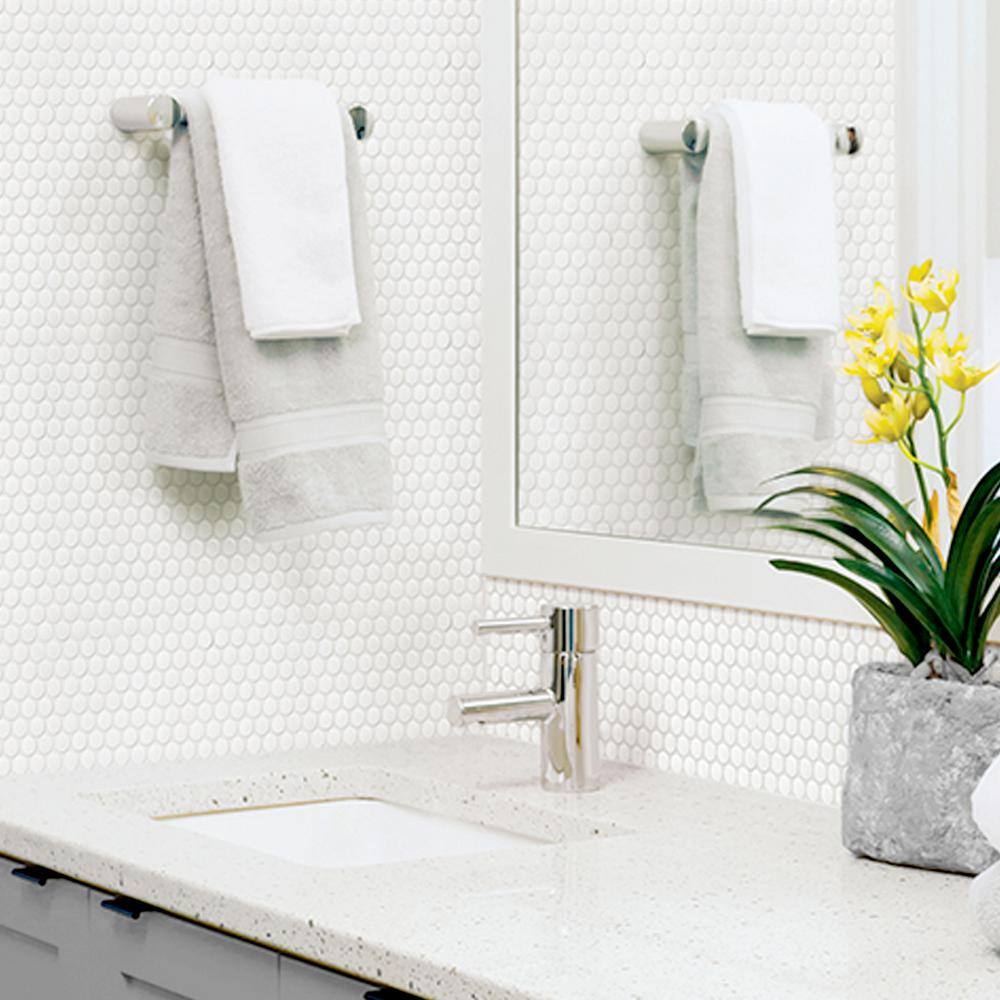 Brighten backsplashes, showers, and feature walls with Daltile’s Finesse glossy white penny round mosaic. This Grade 1 porcelain tile offers a uniform high-sheen finish on a mesh-mounted 12 in. x 13 in. sheet for easy installation and lasting style.