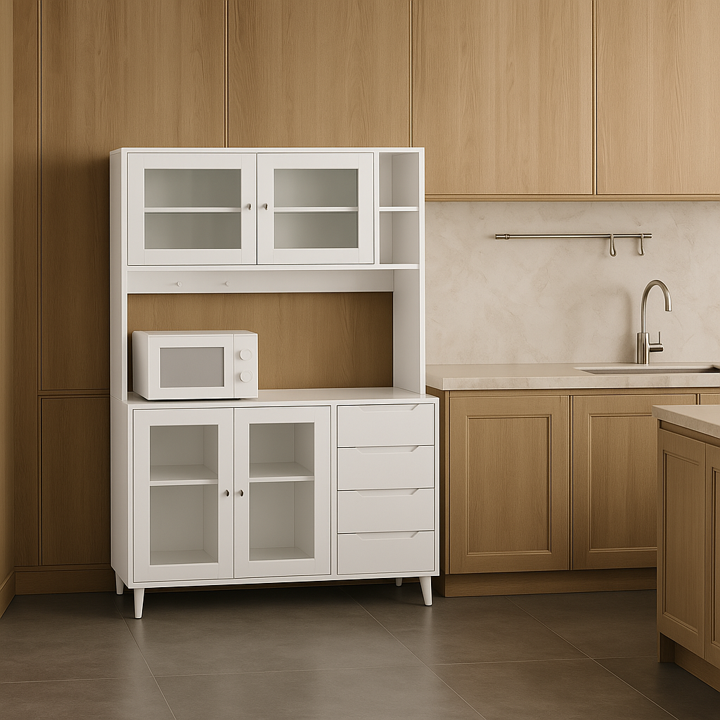 This versatile kitchen cabinet features glass doors, multiple drawers, and open shelves for ample storage. Made from durable MDF and plywood, it combines functionality with a sleek design, perfect for organizing your kitchen essentials.