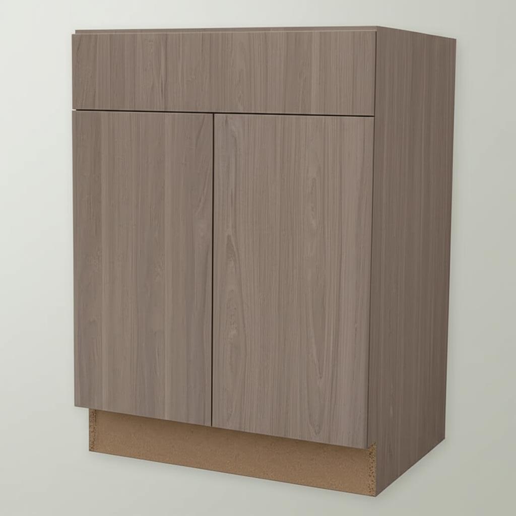 A: The cabinet features a durable Driftwood thermofoil finish that mimics the look of exotic wood grain, suitable for any modern kitchen style.