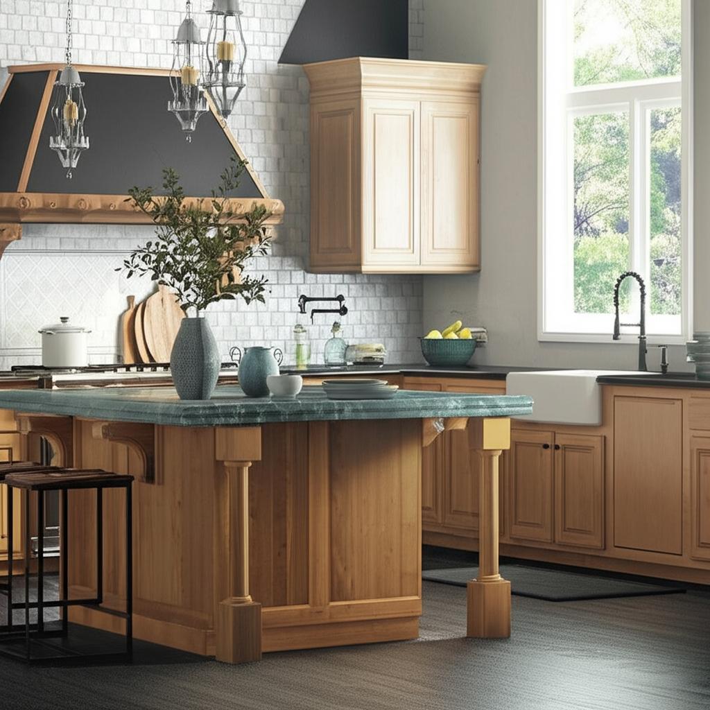 A: The cabinet features a rich, stained finish in natural hickory, complementing rustic and classic kitchen styles.