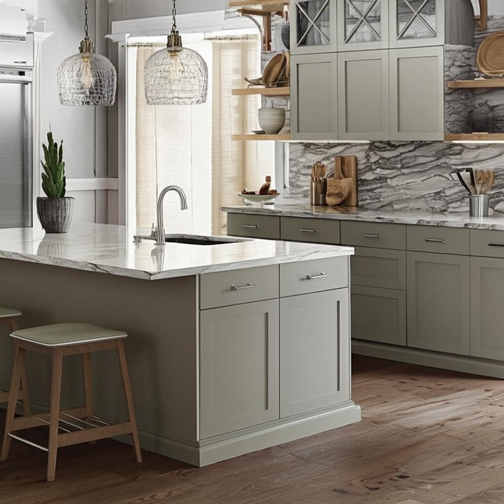 - Elegant Design: Full-overlay Shaker doors with a dusk gray laminate finish for a modern look.