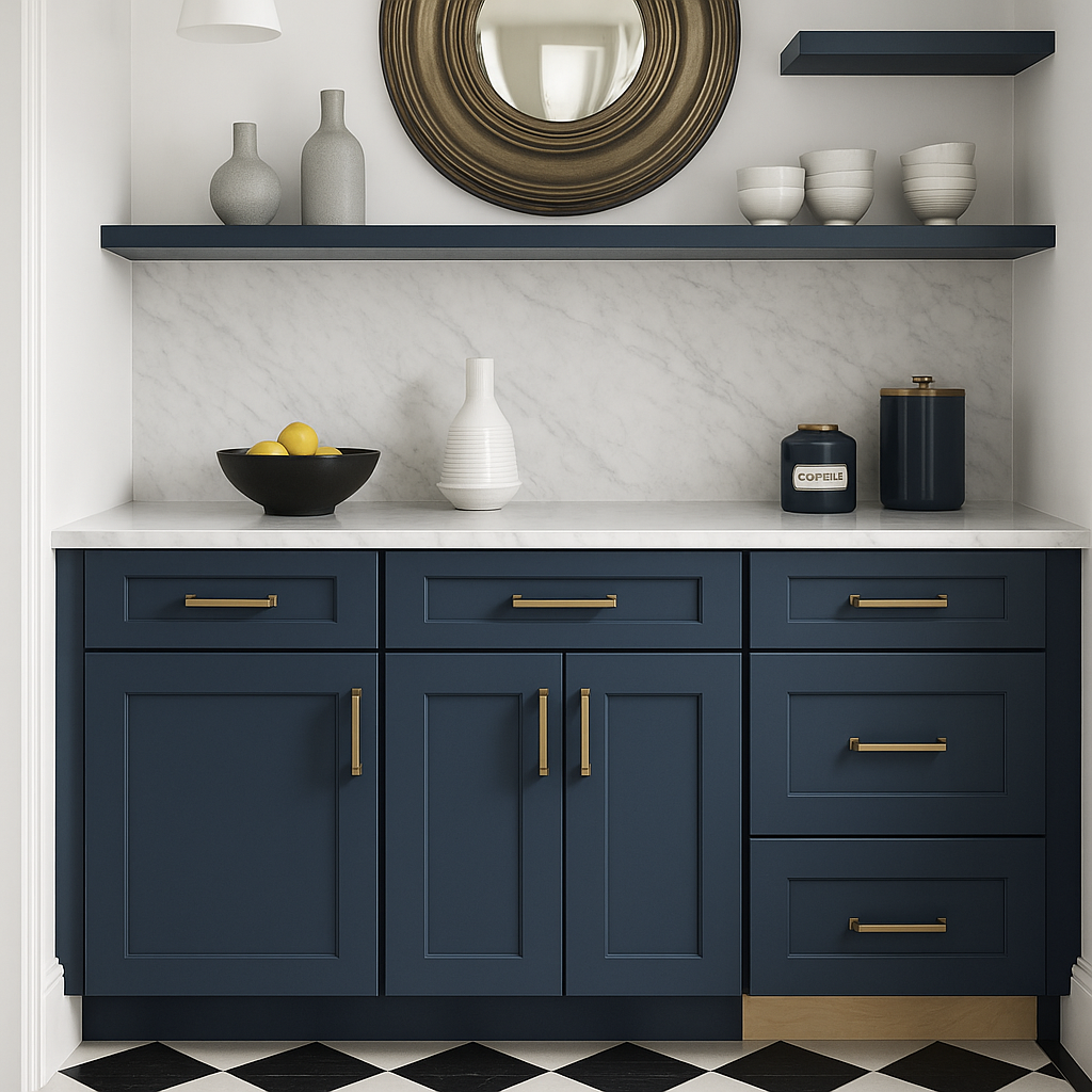 - Elegant Design: Valencia Blue thermofoil finish with contrasting white back panel.