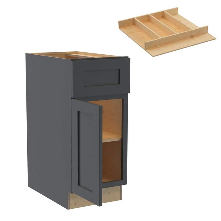 Upgrade your kitchen with the Home Decorators Collection 15" Deep Onyx Utility Base Cabinet. Featuring shaker-style doors, painted in a chic deep onyx finish, this cabinet is made from durable plywood with soft-close technology for smooth, effortless operation. Adjustable shelves and a full-width utensil compartment enhance functionality, bringing both style and storage to your space.