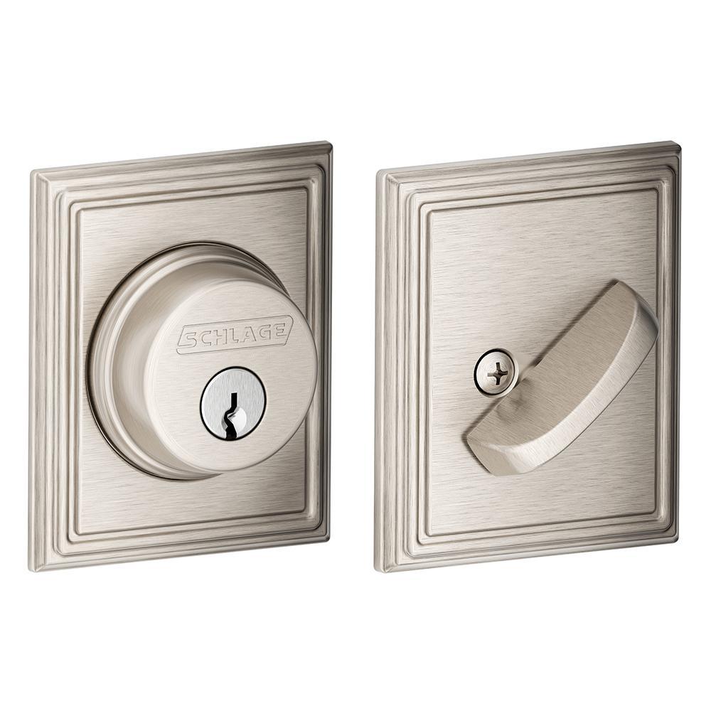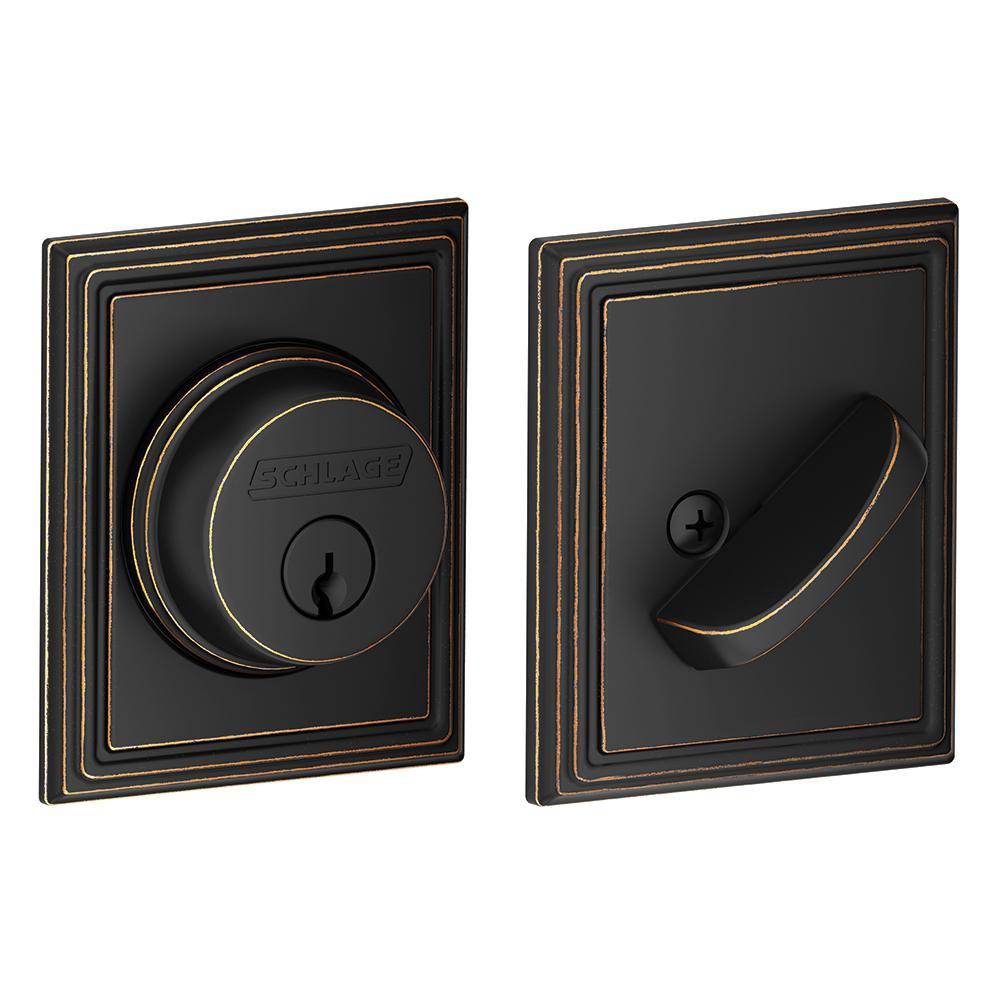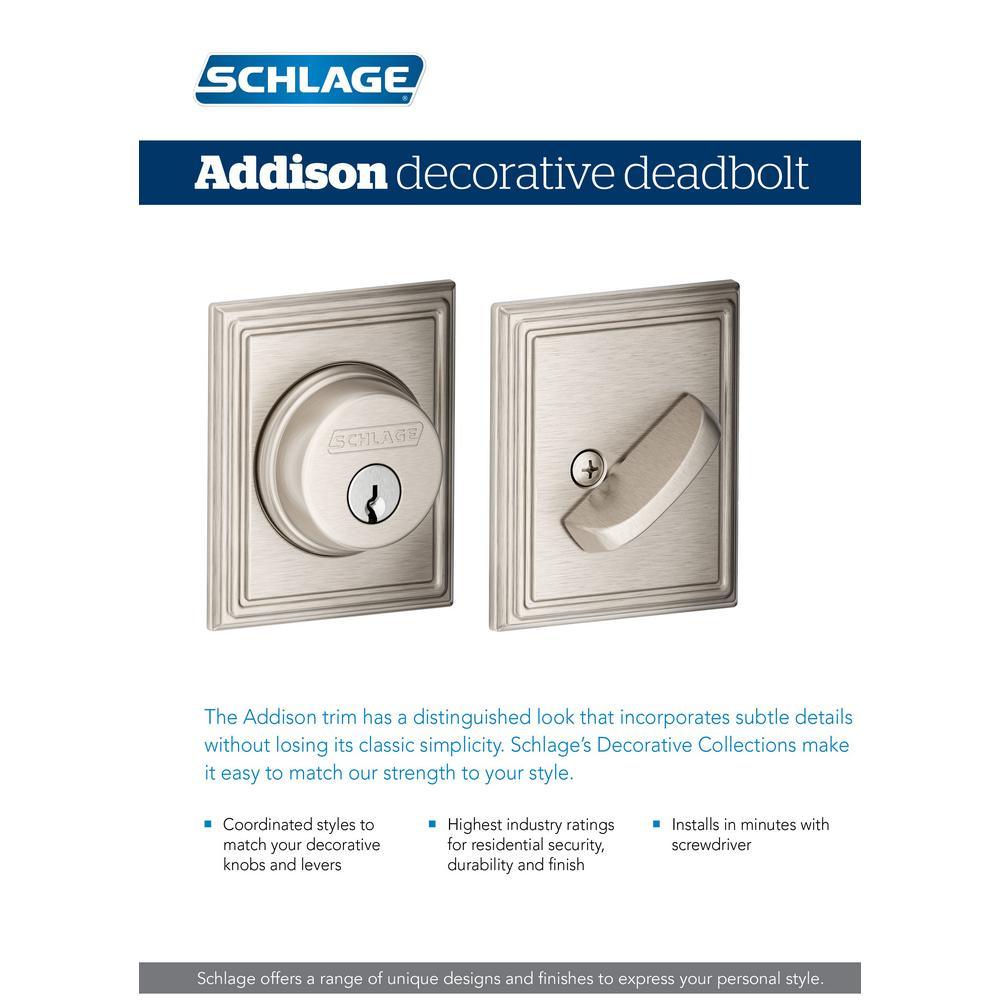 The Schlage Addison Matte Black Single Cylinder Deadbolt is perfect for use on exterior doors and adds an extra layer of security to your exterior handleset or knob/knob. The Addison trim's distinguished look incorporates subtle details without losing its classic simplicity. When finished in Matte Black, the deadbolt looks especially elegant. Plus, it's been designed and tested with strength and durability in mind.
