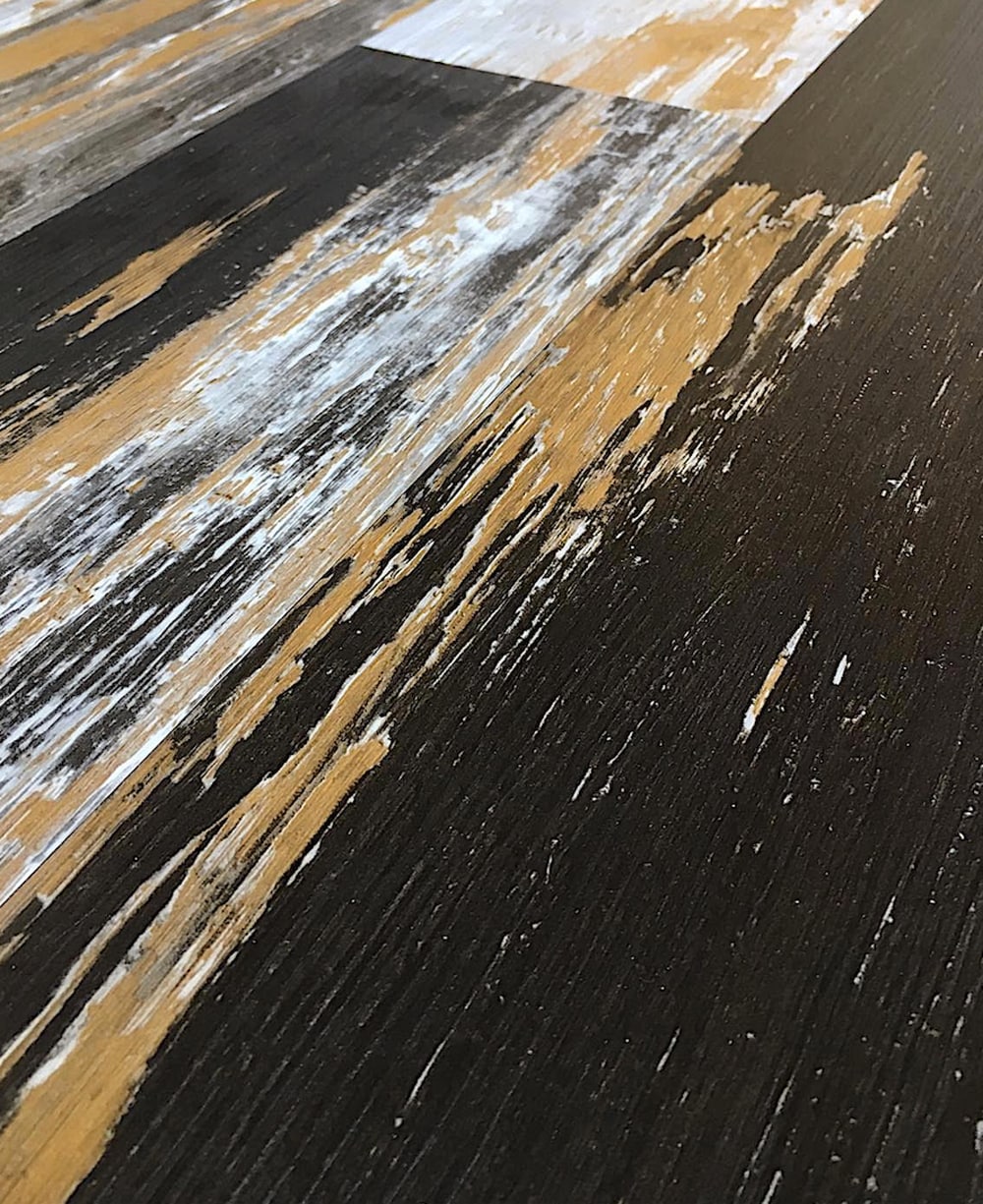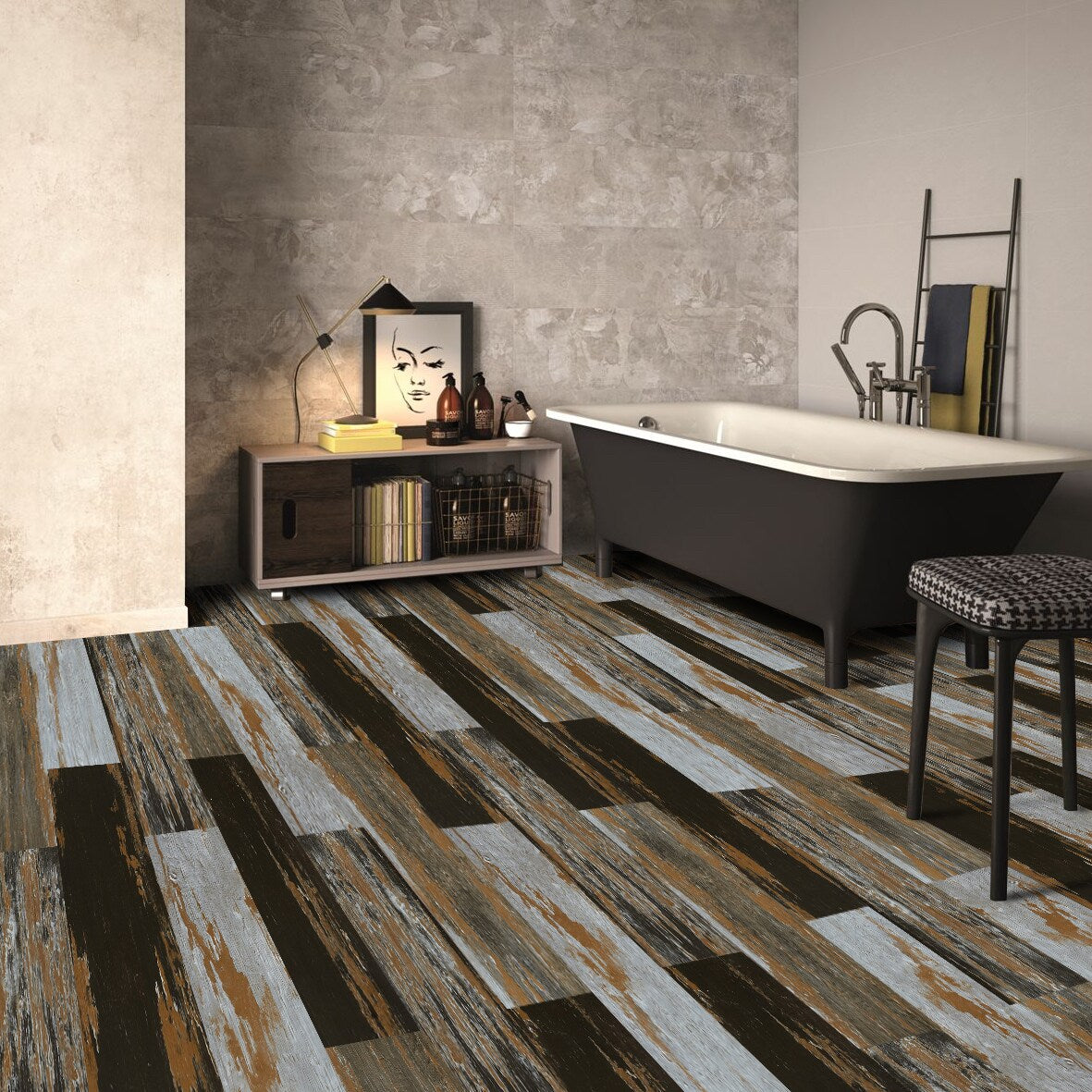 Painted, aged-wood style luxury vinyl planks bring dramatic, multi-tonal character to floors or walls. At 2 mm thick with an 8-mil urethane wear layer, these glue-down planks are 100% waterproof and easy to clean—ideal for bathrooms, kitchens, and high-style spaces.