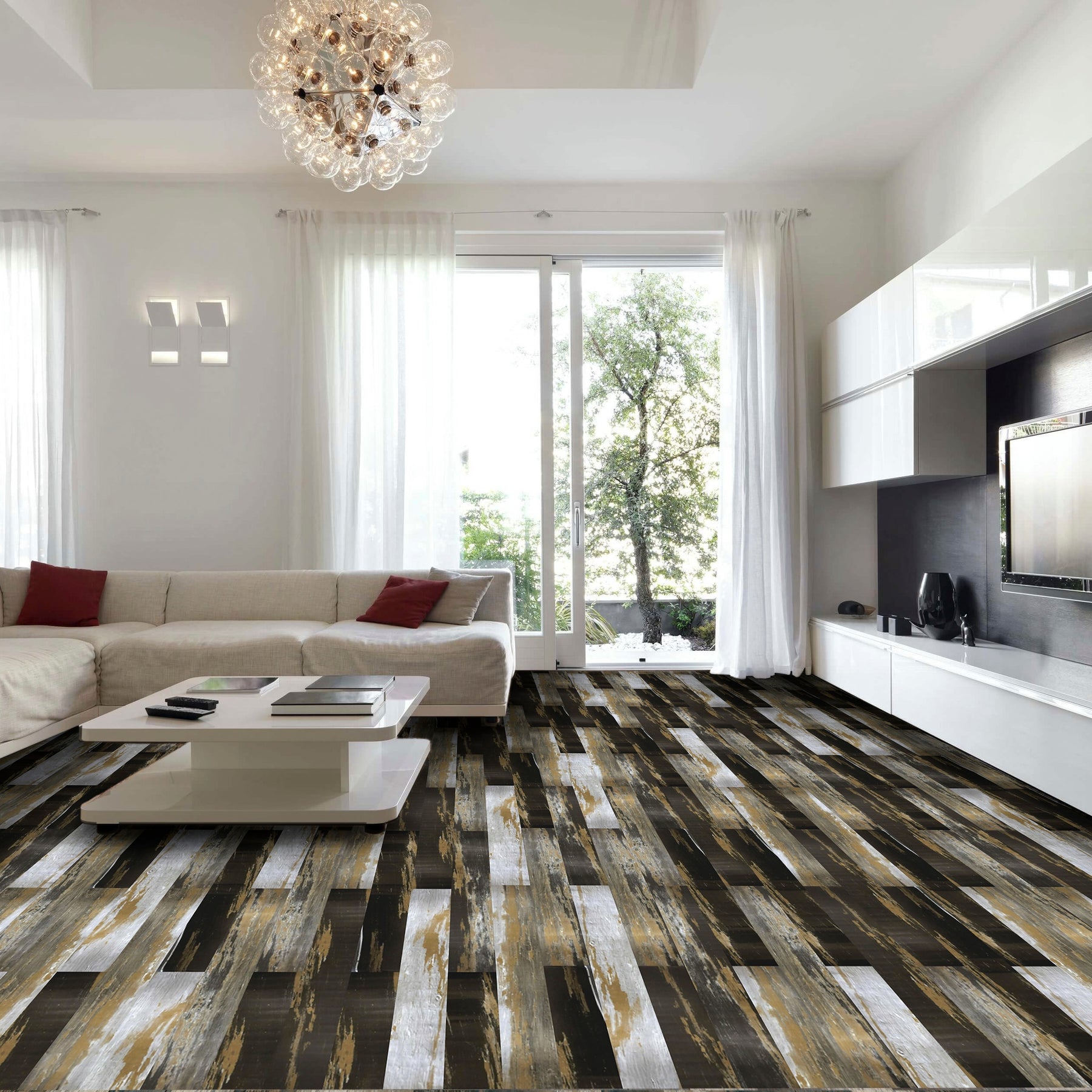 This plank sings with a weathered, painterly patina—charcoal, bronze, and chalky white brush across each board for instant, artful tension. The embossed texture heightens the rustic sophistication, giving modern rooms soulful depth. Run it floor-to-wall for a cocooning statement or mix with crisp whites and matte black metals for gallery-like contrast. It’s a quietly bold essential that elevates everyday living with luxe, lived-in character.
