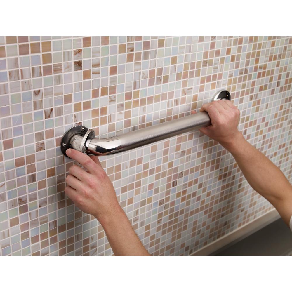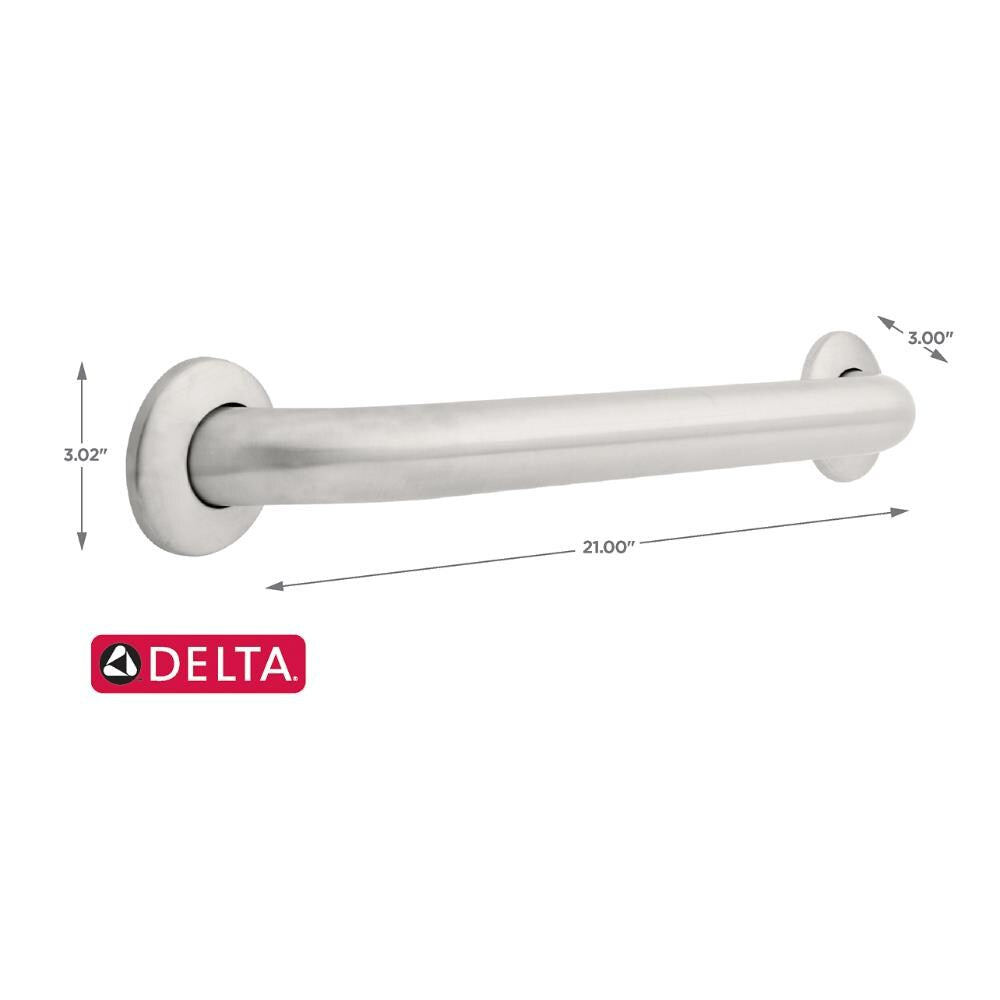 This DELTA wall-mount grab bar delivers secure support in bathrooms with a durable stainless steel construction and a satin finish. ADA compliant and tested to hold up to 500 lb, it installs on studs or with compatible wall anchors for versatile placement.