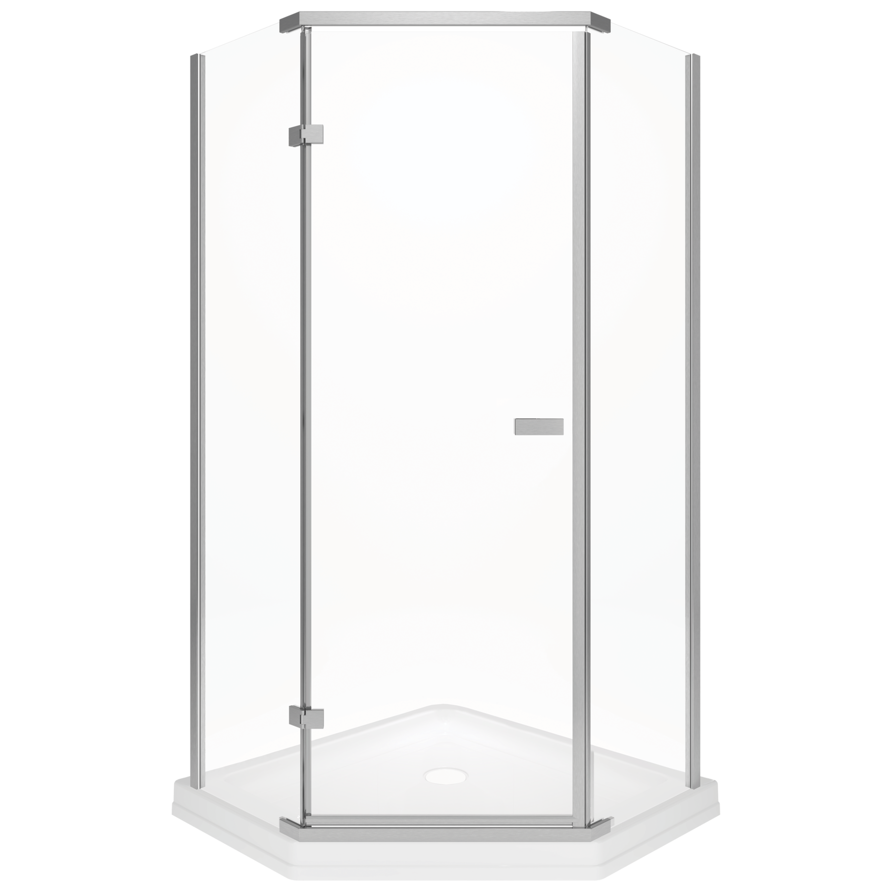This semi-frameless neo-angle shower carves a chic geometric silhouette that instantly elevates a compact bath. The Stainless finish trim punctuates the crystal-clear panels, while the bright white base glows with a high-gloss sheen. Style it with warm, linear tile and brushed accents to balance its clean lines. A polished essential that brings luxurious simplicity to everyday rituals.