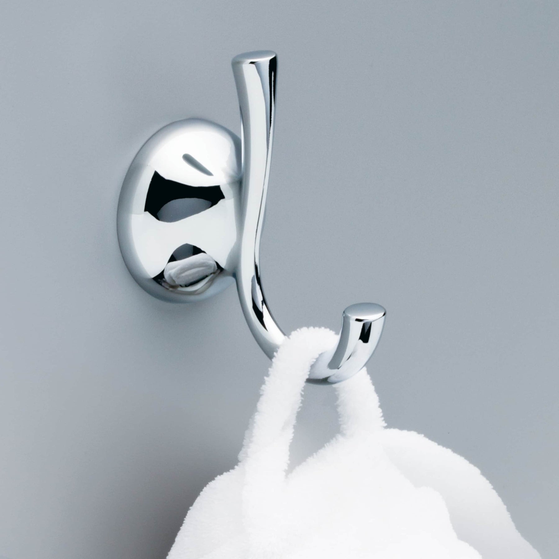 This Delta Foundations double hook keeps towels and robes within easy reach while adding a sleek, high-gloss touch to your bath. Crafted from durable zinc with a polished chrome finish, it mounts to the wall and supports everyday use with lasting corrosion resistance.