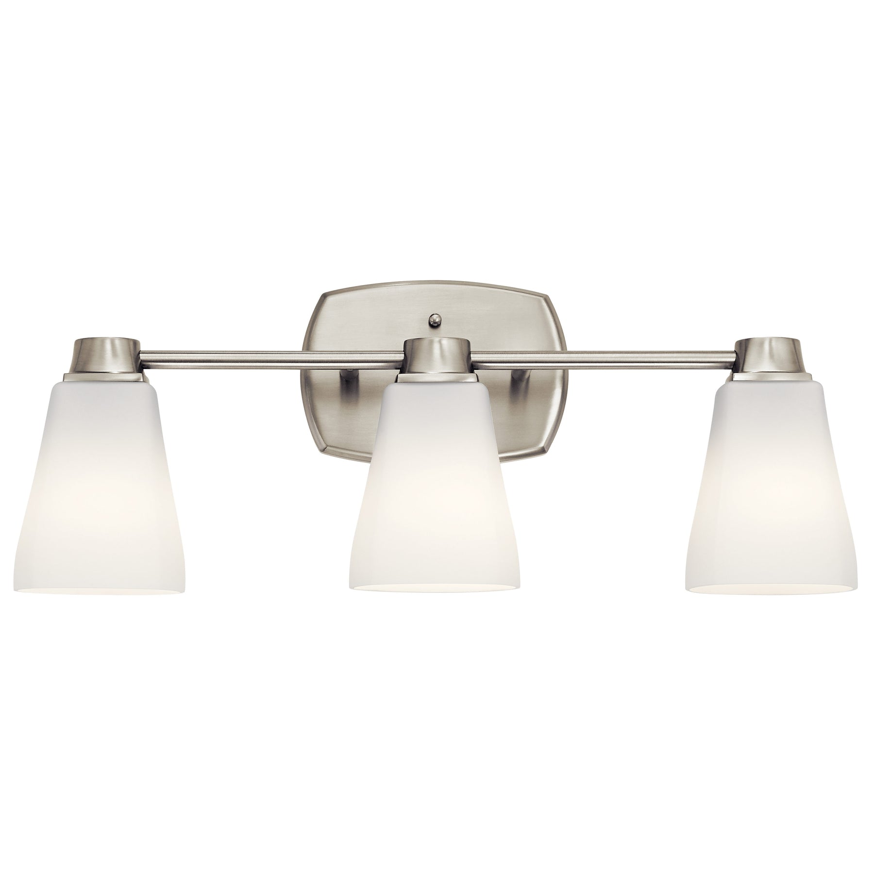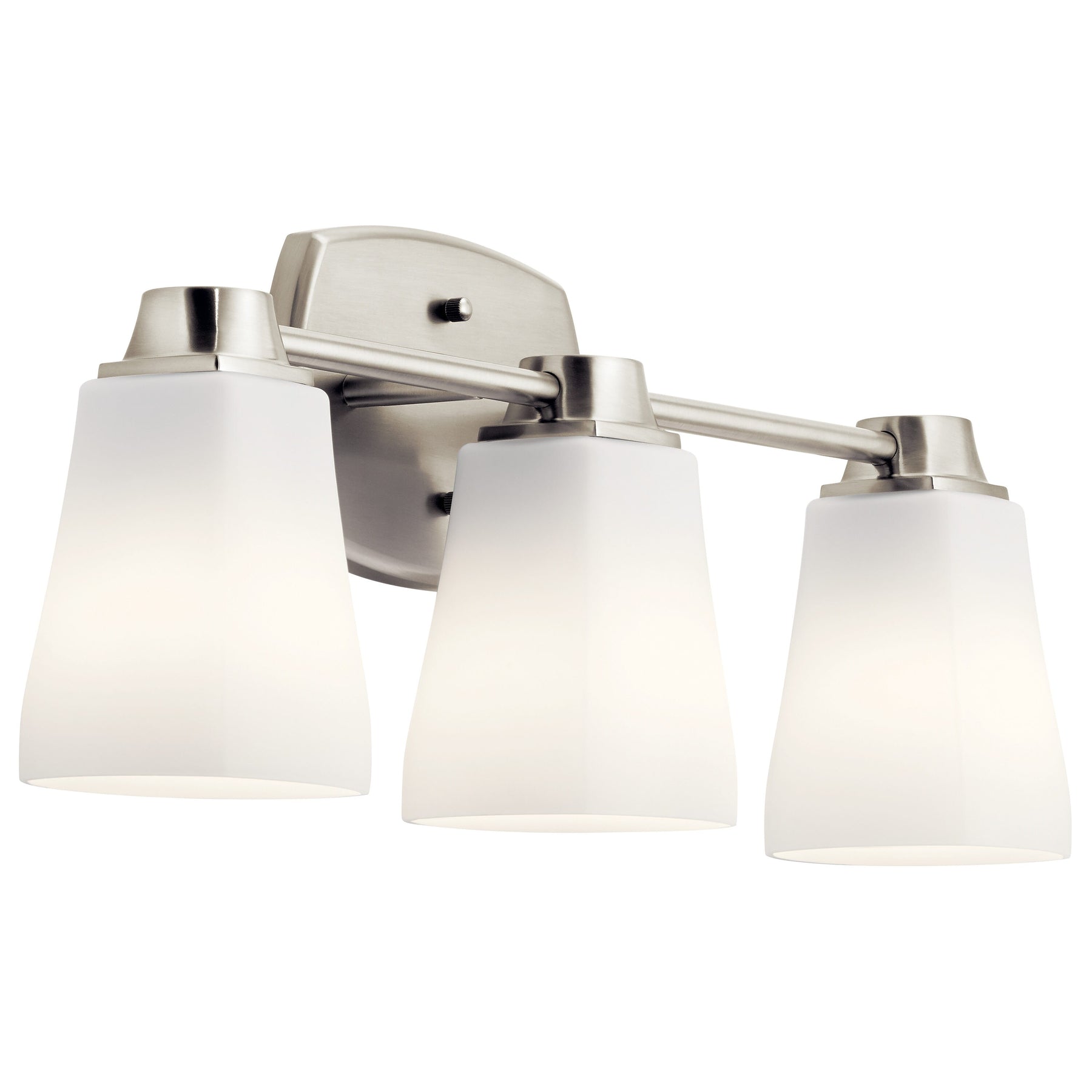 The Delta Sandover vanity light pairs a brushed nickel finish with satin-etched cased opal glass shades for clean, classic illumination. This hardwired, damp-rated fixture holds three medium-base bulbs to brighten bathrooms with up or down lighting.