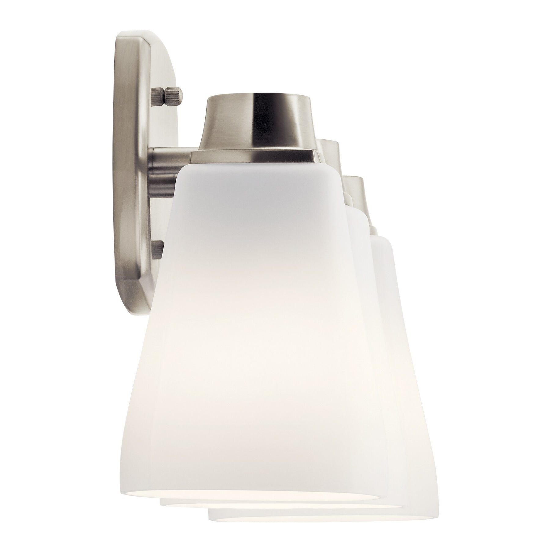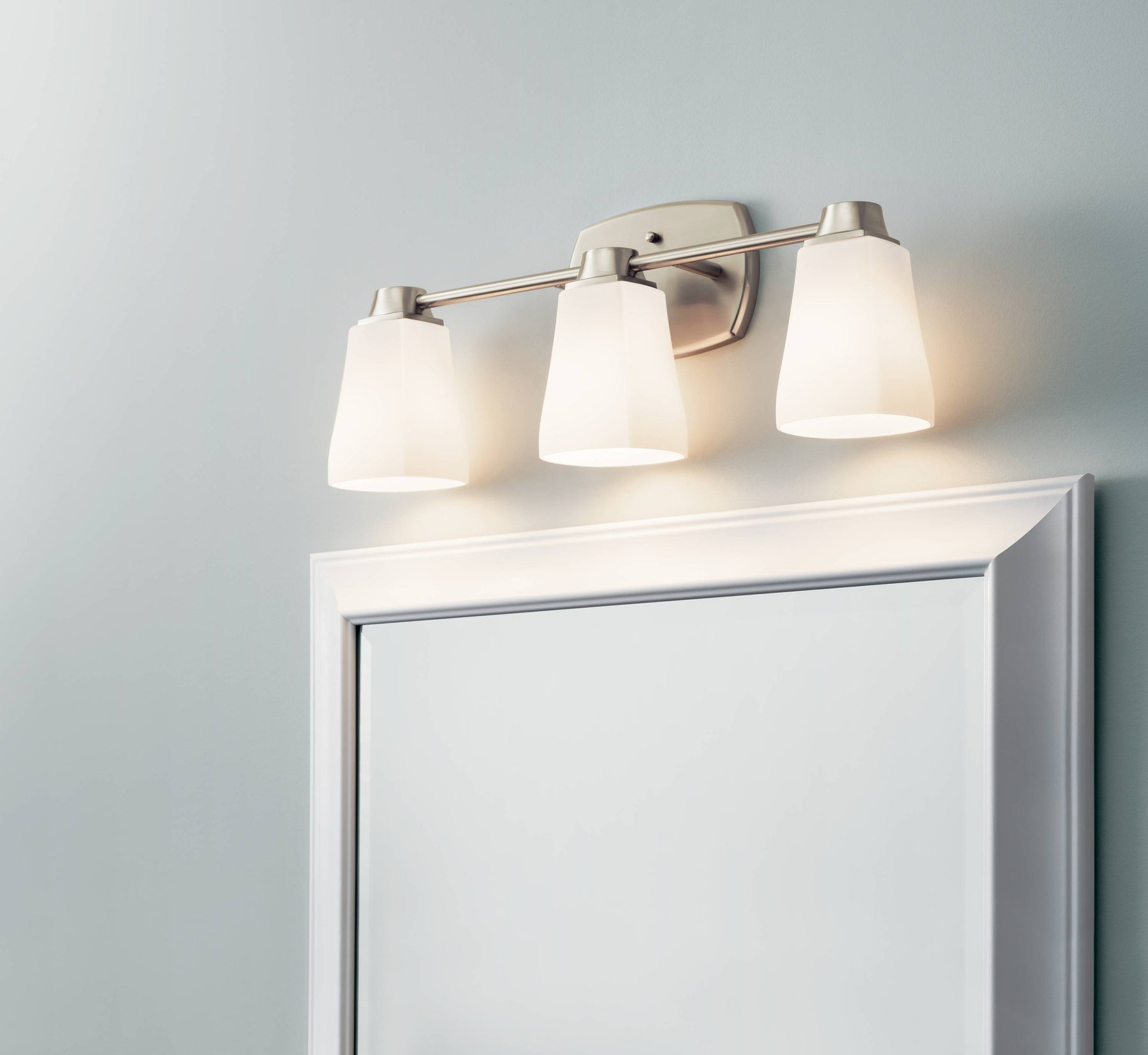 • Classic Finish and Glass: Brushed nickel with satin-etched cased opal glass for a timeless bathroom look