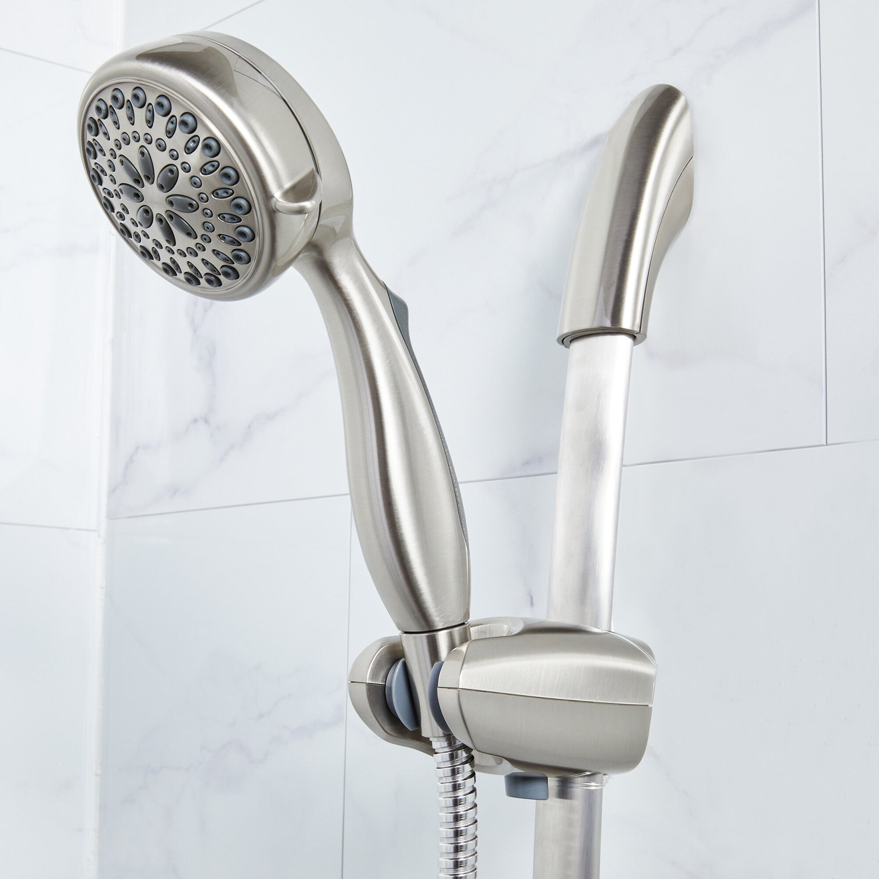 This handheld shower and slide bar brings a sleek, architectural curve to the bath, bathing the space in the warm luster of brushed nickel. The petal-pattern face adds a refined note while seven sprays deliver a spa-caliber experience. Style it against crisp marble or matte porcelain to let the silhouette sing, and adjust the bar to create a personalized, effortless ritual. It’s a polished essential that elevates daily luxury.