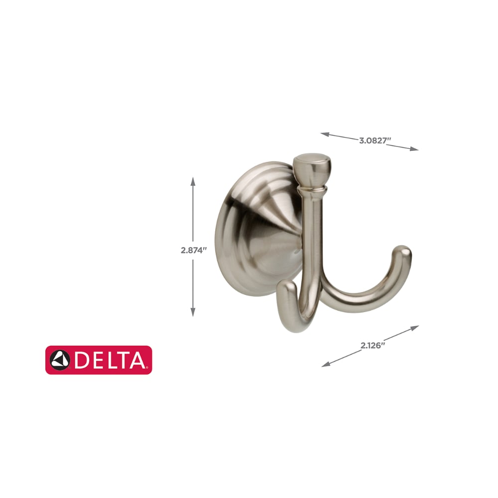 This Delta Windemere double hook brings casual elegance and everyday convenience to your bath. The brushed nickel SpotShield finish resists water spots and fingerprints, while durable zinc construction ensures long-lasting performance.