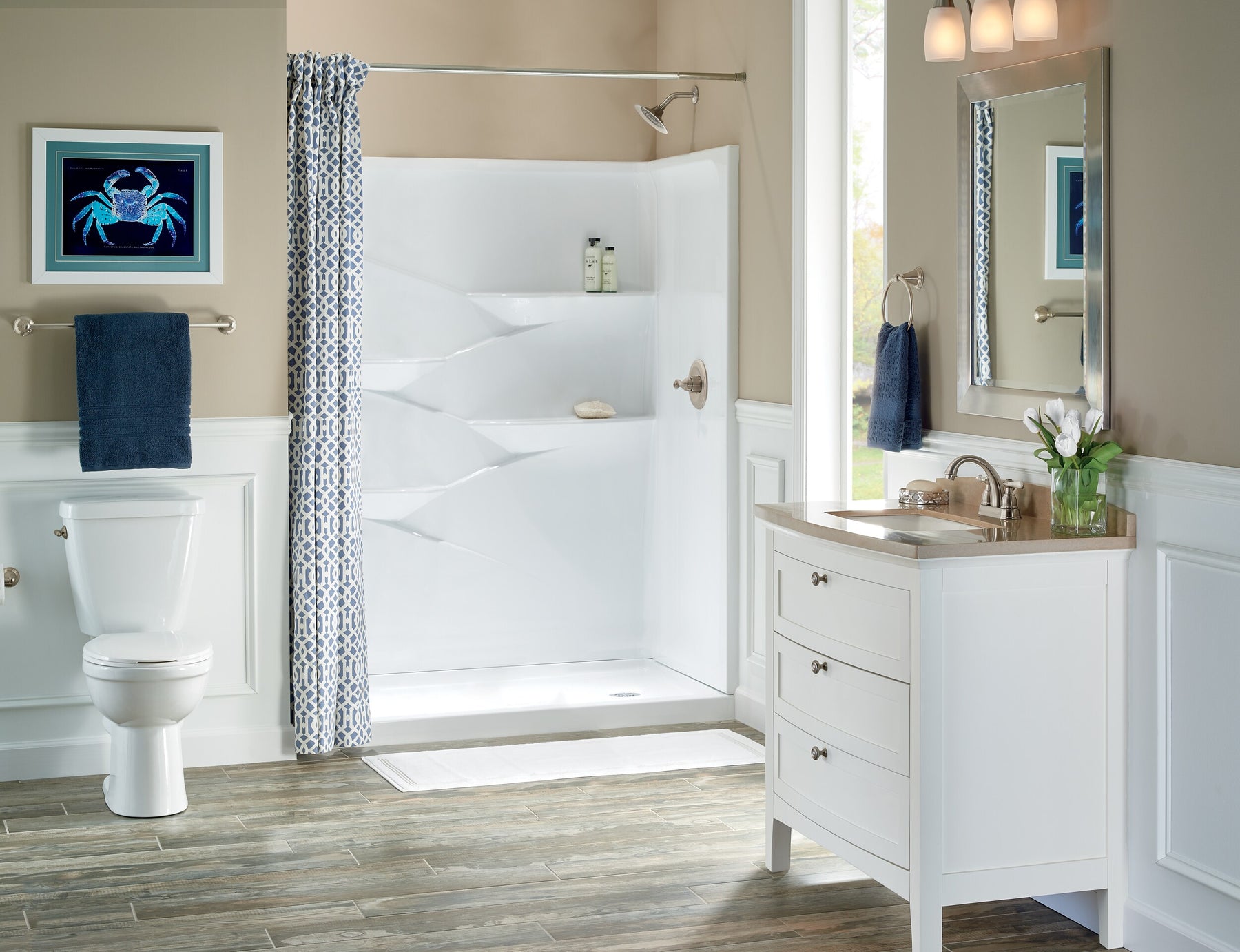 Windemere’s sculpted silhouette lends a soft, traditional note that instantly refines the bath. The brushed nickel finish offers a gentle sheen that pairs beautifully with both cool grays and warm neutrals. Style it near a vanity with plush white towels for a crisp, spa-like moment. It’s a small luxury that elevates everyday rituals.