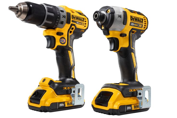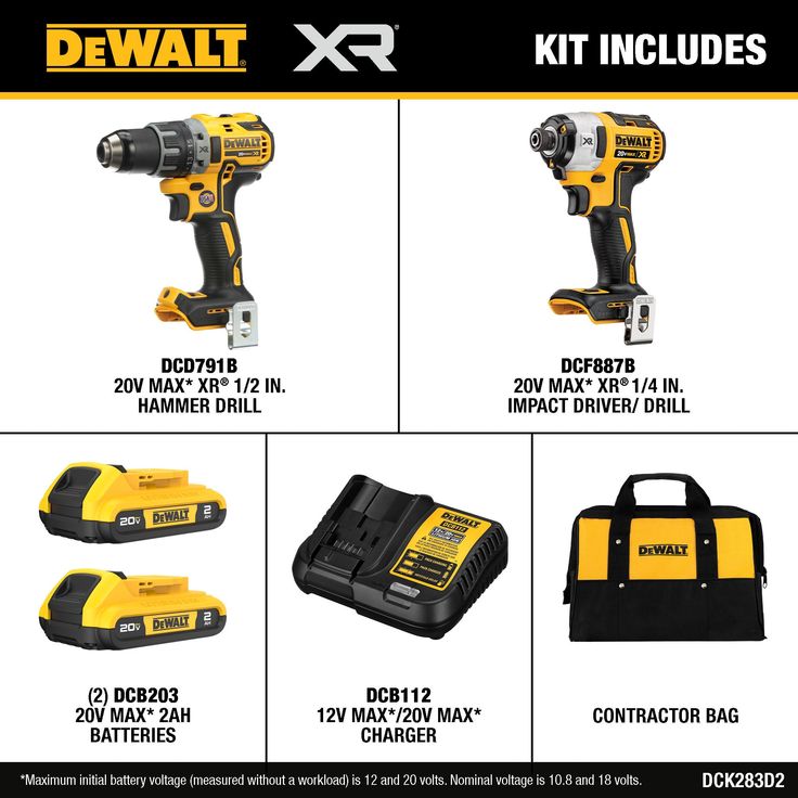 20-volt MAX 1/2-in drill/driver compact (6.9-in front to back), lightweight (3.4-lb) design fits into tight areas DCD791 features 3-mode LED with with 20 minute trigger release delay in spotlight mode providing increased visibility in dark or confined spaces 20-volt MAX 1/4-in impact driver compact (5.3-in front to back) design fits into tight areas DCF887 features 3 LED lights embedded in front of tool with 20 second trigger release delay providing increased visibility in dark or confined spaces DEWALT brushless motor delivers up to 57% more run-time over brushed XR Li-ion batteries with fuel gauge provide 33% more capacity over standard packs Kit includes (1) DCD791 20V MAX drill/driver, (1) DCF887 20-volt MAX impact driver, (2) DCB203 20-volt MAX lithim ion 2.0-AH batteries, (2) belt hooks, charger and contractor bag Made in USA with global materials