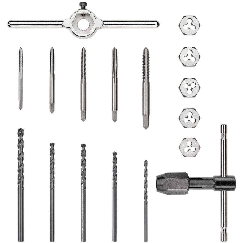 • Includes 1 of each of the following: 6-32 tap, 8-32 tap, 10-24 tap, 10-32 tap, 1/4 in.-20 tap, 6-32 die, 8-32 die, 10-24 die, 10-32 die, 1/4 in.-20 die, # 36 drill bit, #29 drill bit, #25 drill bit, #21 drill bit, #7 drill bit for, 1/4 in. tap handle, 5/8 in. hex die handle