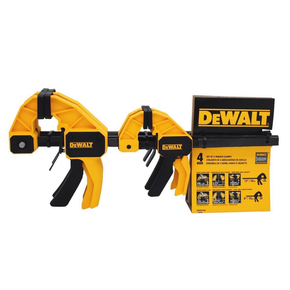 DEWALT is the number 1 brand for woodworking and the Pro. These DEWALT 4-Pack Medium and Large Trigger Clamp pack is ideal for a variety of jobs including holding, spreading and glue ups. The Large Trigger Clamp have the capability to convert to a spreader with 1 touch of the quick change button. They also have a 300 lb. clamping force that makes them ideal for larger fastening jobs the Pro may have. The Medium clamp in this 4-pack have a clamping force of 100 lbs. No matter the job, DEWALT is guaranteed tough.