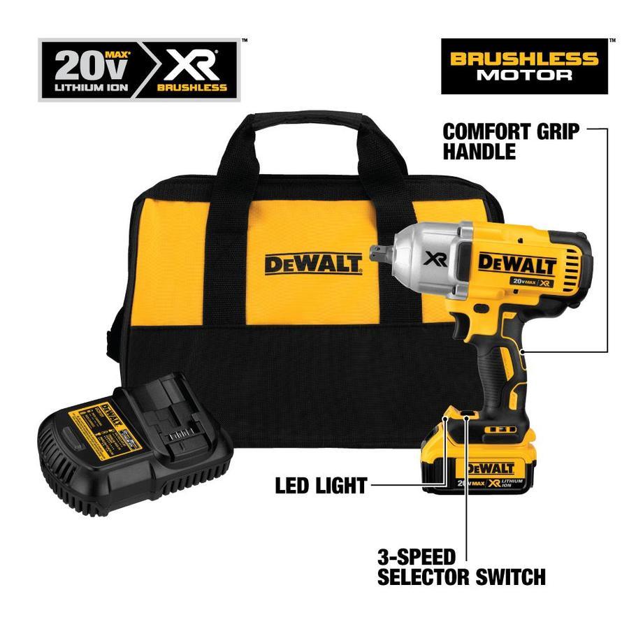 Up to 700 ft-lbs of max torque and 1200 ft-lbs of max breakaway torque Compact design of 8-13/16-in in length and weighs only 7.2-lbs Multi-speed control for a variety of applications (0-400/1,200/1,900 RPM) Heavy duty 1/2-in anvil with detent pin LED light with 20 second delay for increased visibility Includes 1/2-in (13 mm) impact wrench, 20V MAX XR premium lithium ion battery (4.0 Ah), charger and contractor bag Made in the USA with global materials