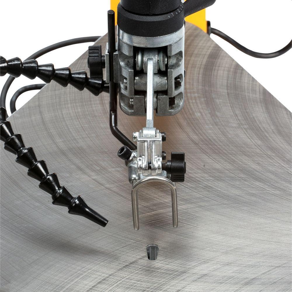 Precision scroll saw kit featuring DEWALT’s 20 in. variable-speed corded scroll saw paired with a sturdy metal stand. Double parallel-link arm design minimizes vibration for smooth, accurate cuts, while the cast-iron table bevels 45° left and right for versatility.