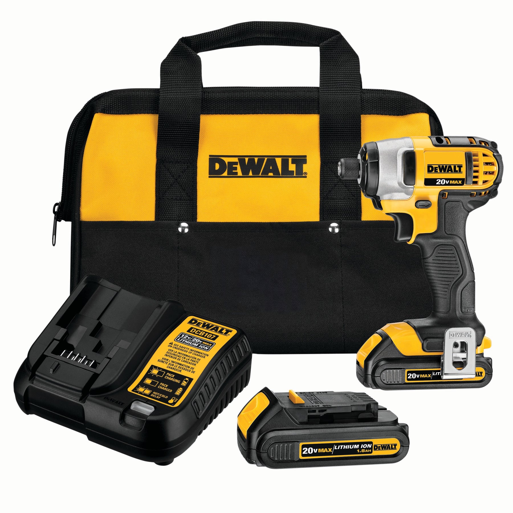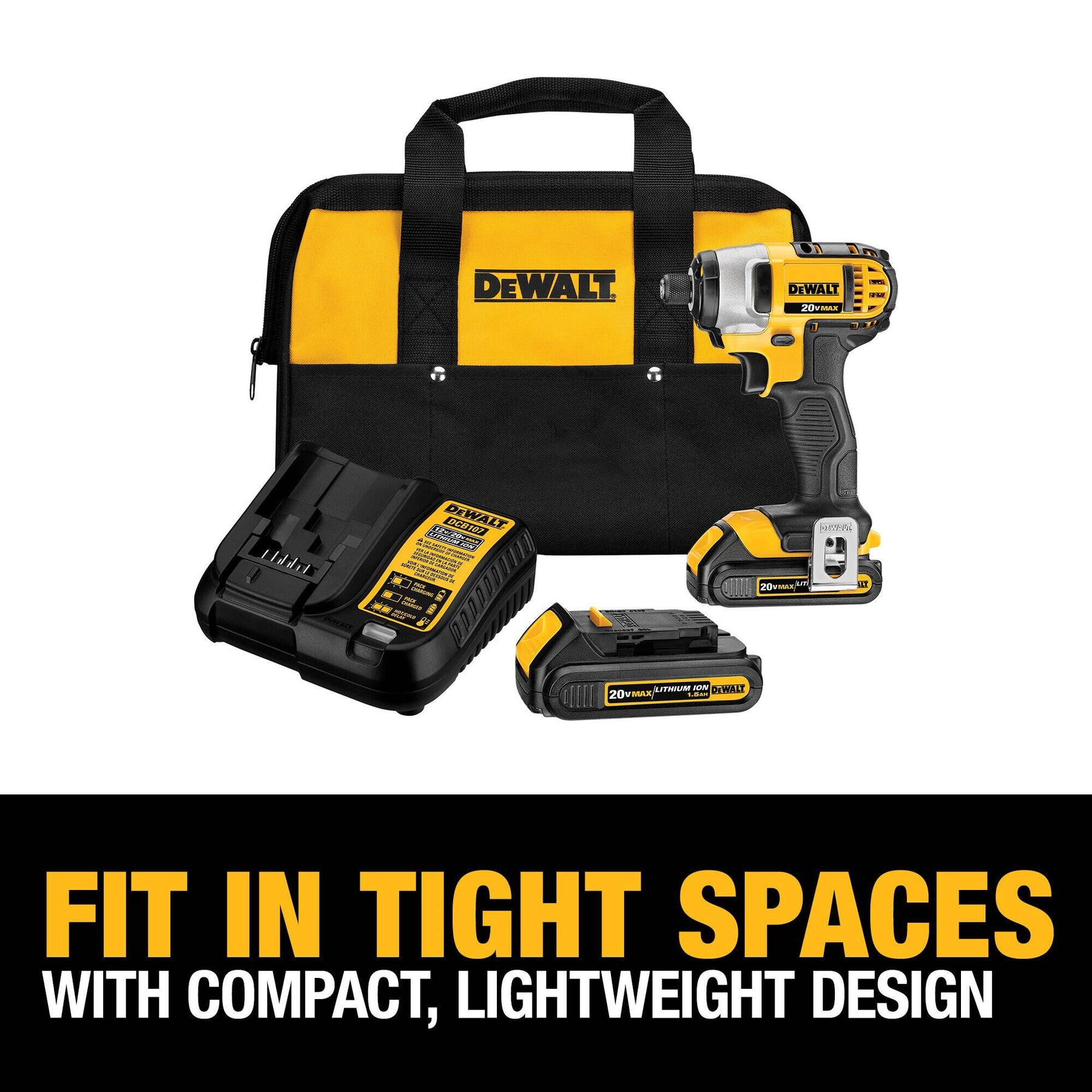 Compact and powerful, this DEWALT 20V MAX 1/4-in cordless impact driver delivers up to 1,400 in-lbs of torque with variable speed control for fast, precise fastening. The kit includes two 1.5Ah lithium-ion batteries, a charger, belt hook, and a soft bag for grab-and-go convenience.