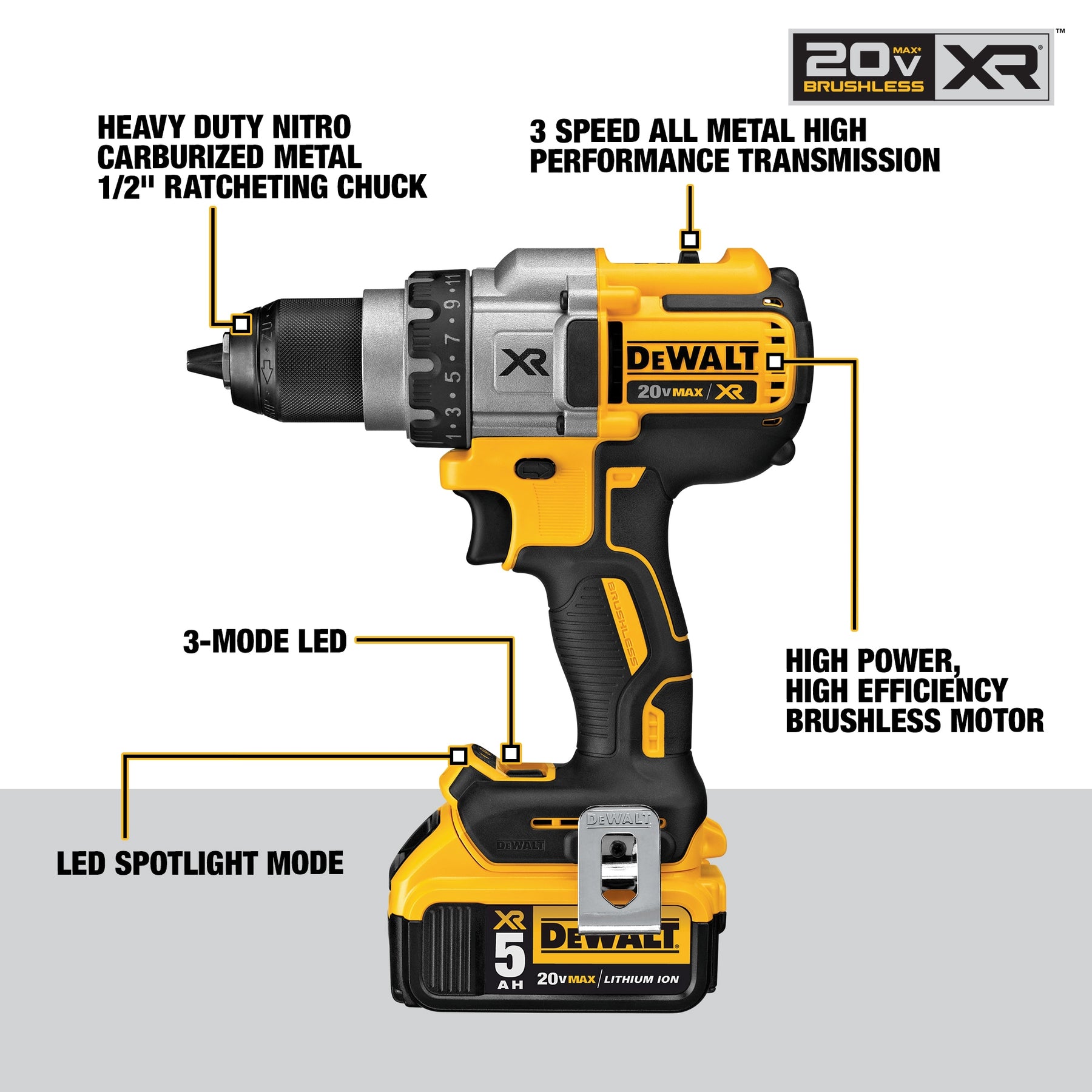 Power through tough jobs with DEWALT’s 20V MAX XR brushless 3-speed drill/driver. The kit includes two 5Ah Li‑ion batteries, a fast charger, and case, delivering longer runtime, superior bit grip, and bright LED lighting for demanding applications.