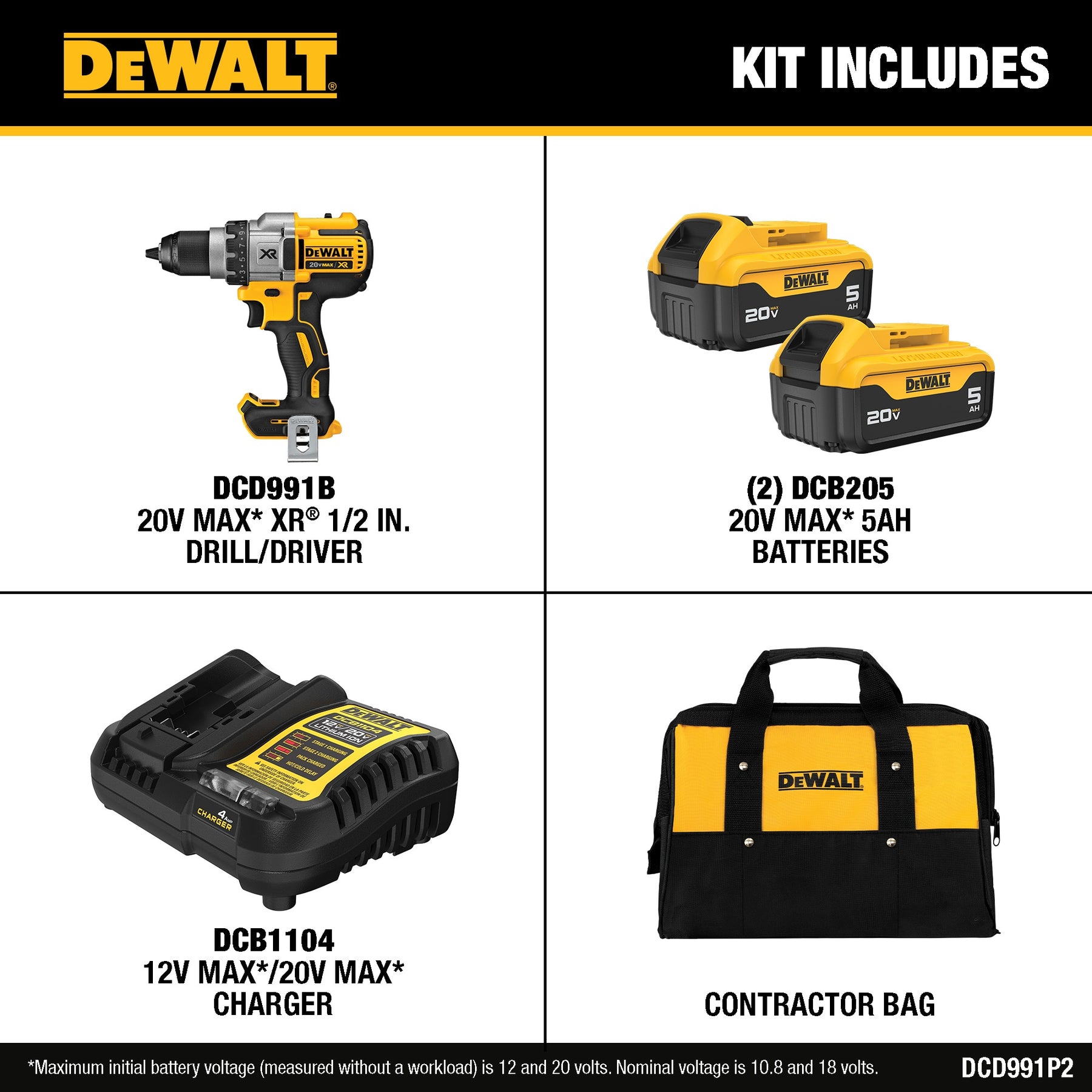 A: Yes. The kit includes a 12V/20V MAX charger (DCB1104) compatible with the two included 20V MAX 5Ah XR batteries.