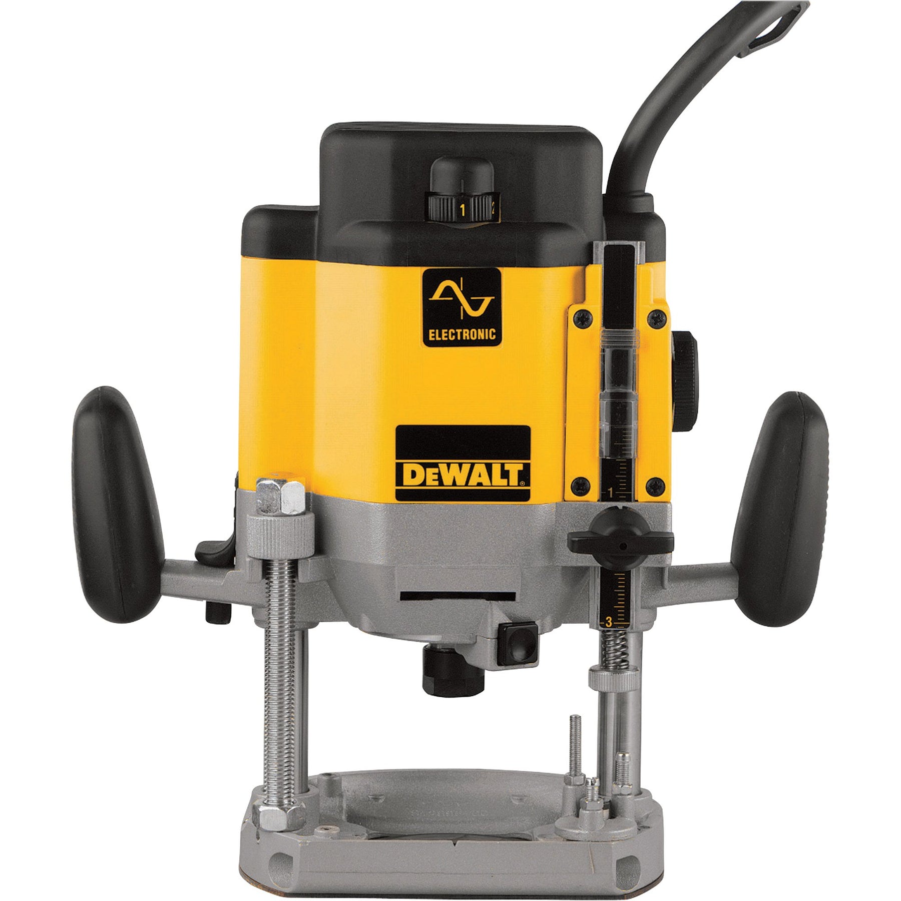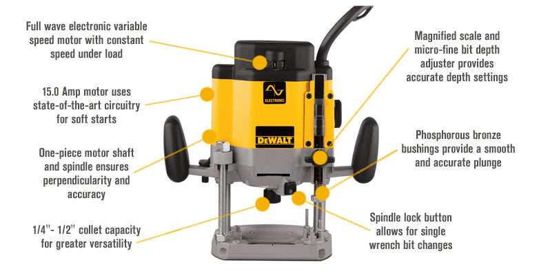 Heavy-duty DEWALT plunge router with a 3 HP, 15-amp motor and electronic variable speed maintains consistent power under load. Precision features like phosphorous bronze bushings, magnified depth scale, and single-wrench spindle lock deliver smooth, accurate routing for professional woodworking.