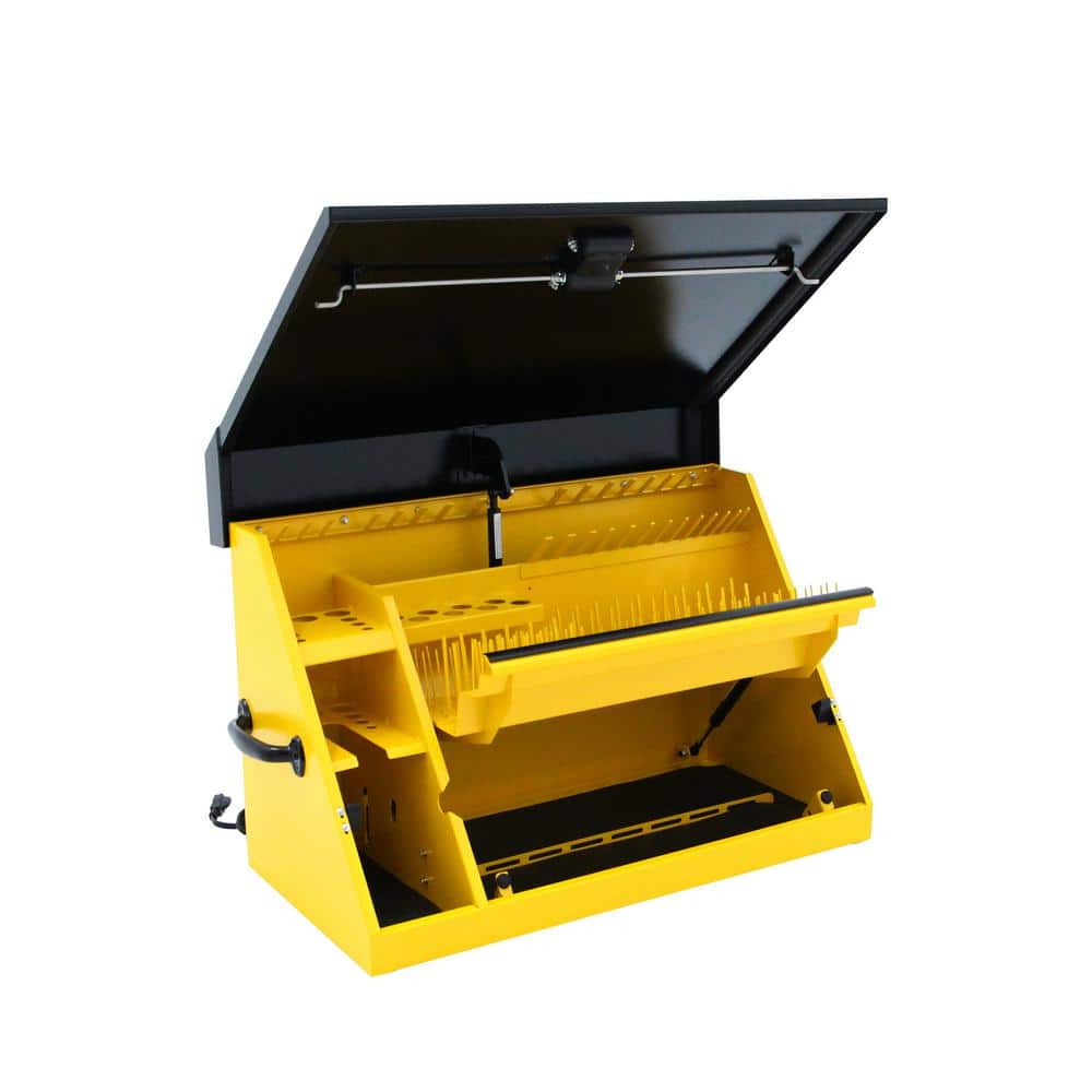 The DEWALT 30" Triangle Top Tool Chest is the perfect portable solution for keeping your essential tools organized and readily accessible. Built with durable steel and a striking yellow and black powder coat finish, this tool chest is designed to withstand demanding environments. It features full-height socket pegs, a 3-outlet power strip with USB ports, and a weather seal to protect your tools from moisture and dust.