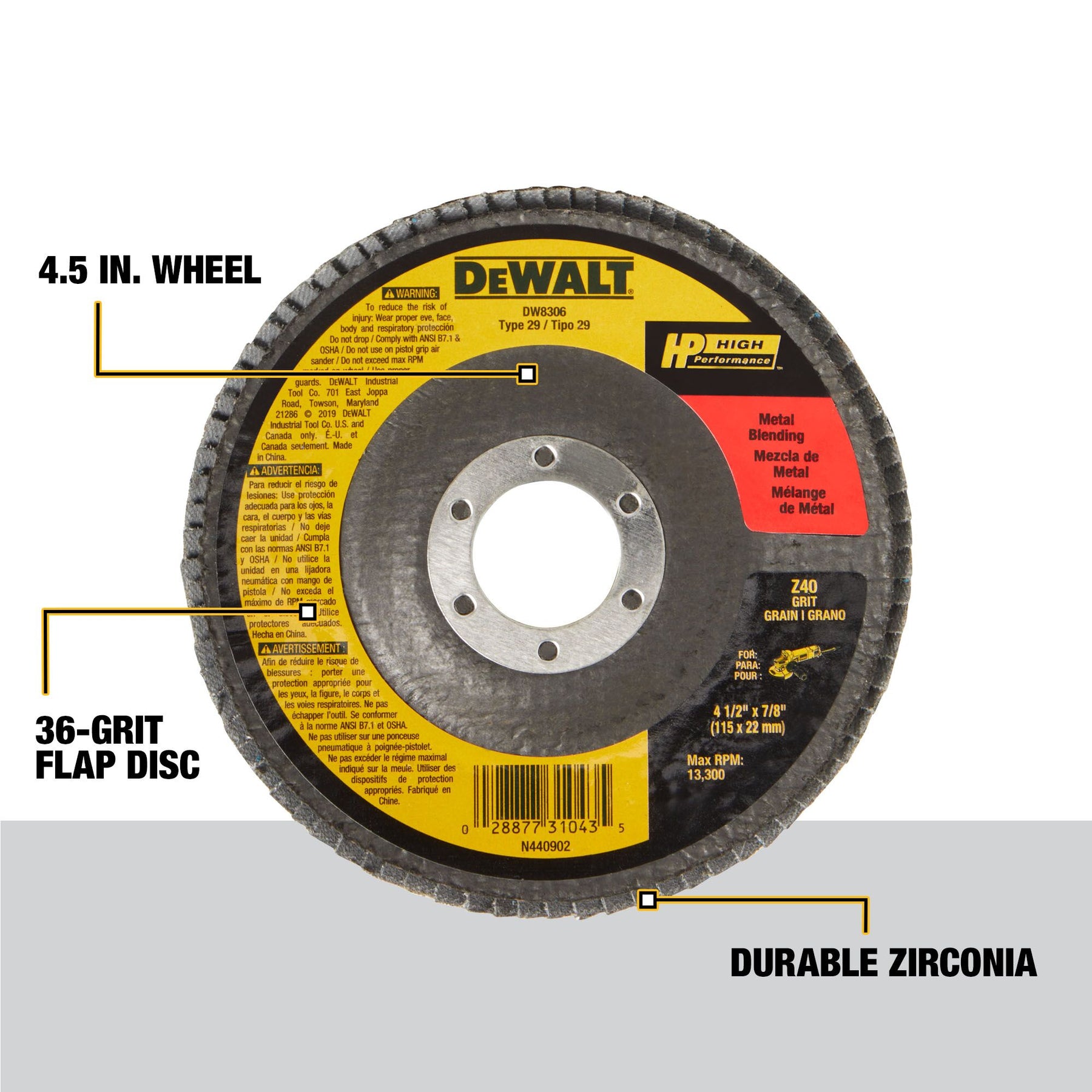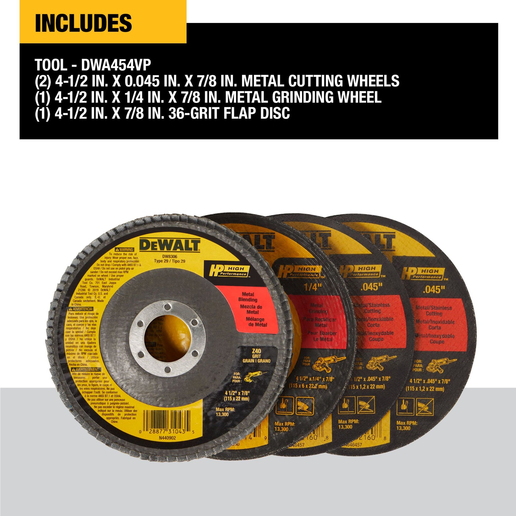 Built for metalwork, this DEWALT 4-pack combines two 4.5-in metal cutting wheels, one 1/4-in grinding wheel, and a 36-grit zirconia flap disc. Designed for 7/8-in arbor angle grinders, it delivers long life and reliable performance on ferrous and stainless steel.