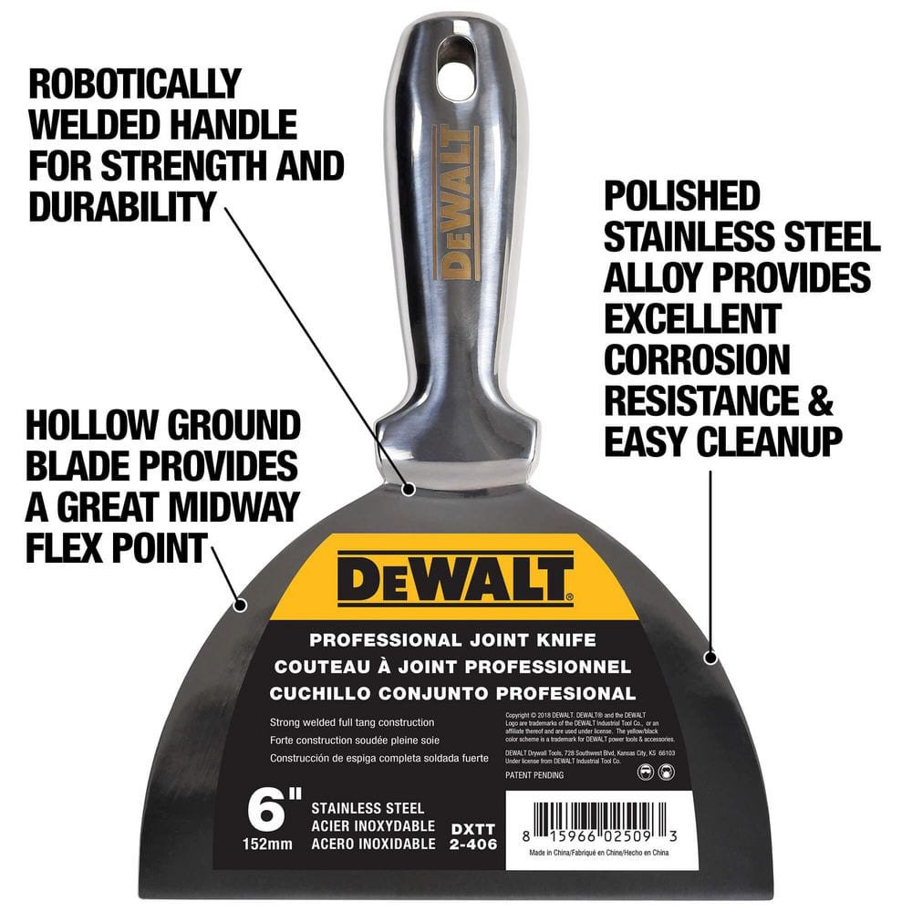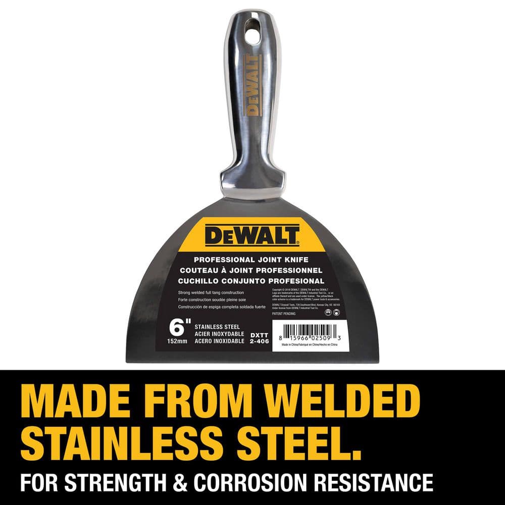 Finish faster and cleaner—add this DEWALT 6 in. welded stainless steel joint knife to your toolkit today.