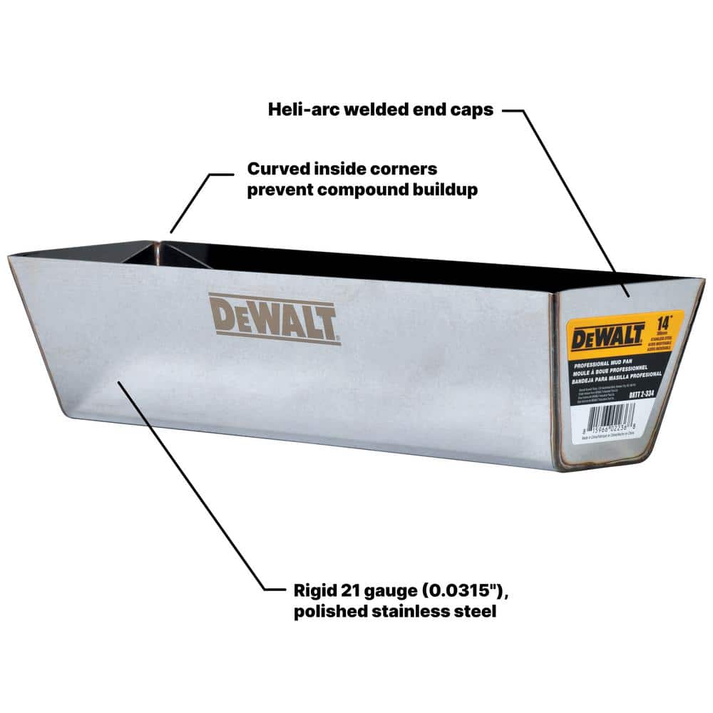 • Pro Mud Pan: 14 in. rigid 21‑gauge polished stainless steel pan with curved corners to prevent compound buildup and straight, sheared edges for clean swipes.