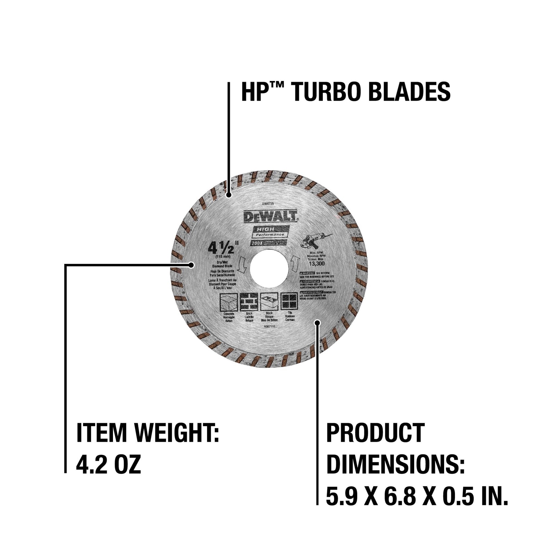 This DEWALT 4.5-in diamond grinding wheel features an HP turbo blade with a high-performance diamond matrix for long life and fast, consistent cuts. Designed for dry or wet cutting of masonry materials like concrete, brick, block, and tile.