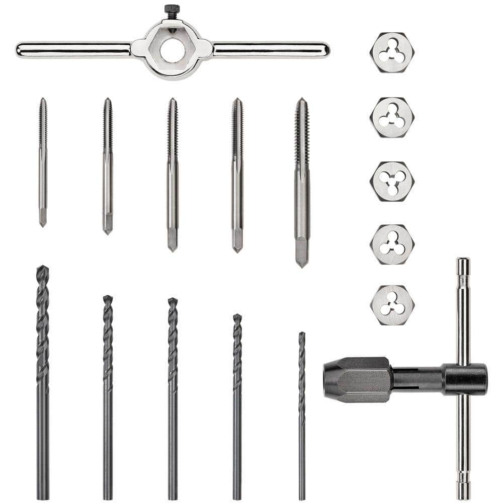 | Includes | 6-32 tap, 8-32 tap, 10-24 tap, 10-32 tap, 1/4-20 tap; 6-32 die, 8-32 die, 10-24 die, 10-32 die, 1/4-20 die; #36, #29, #25, #21, #7 drill bits; 1/4 in. tap handle; 5/8 in. hex die handle |
