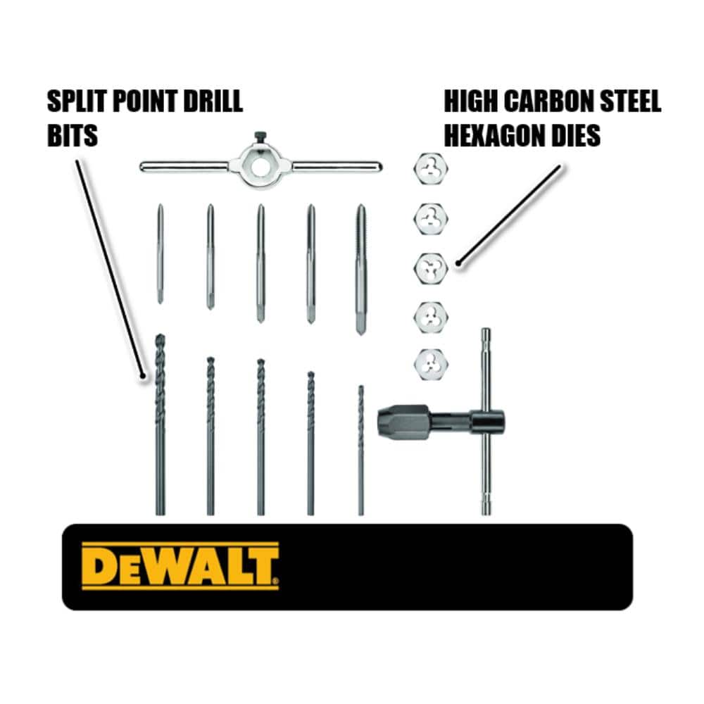 This 17-piece DEWALT set repairs or creates SAE threads with precision. High-carbon steel taps and hex dies pair with black oxide split-point drill bits for durability and long life, plus tap and die handles for controlled threading.