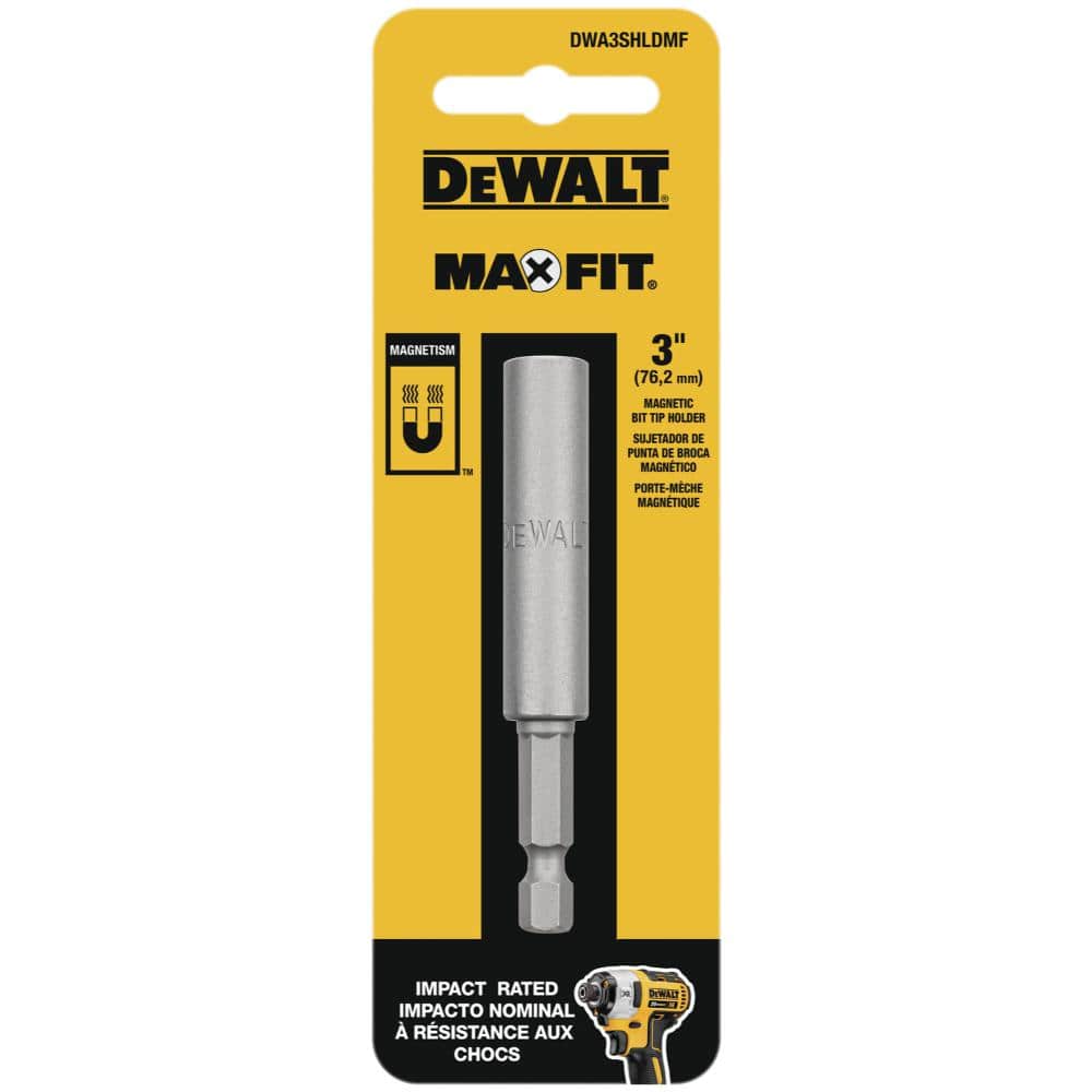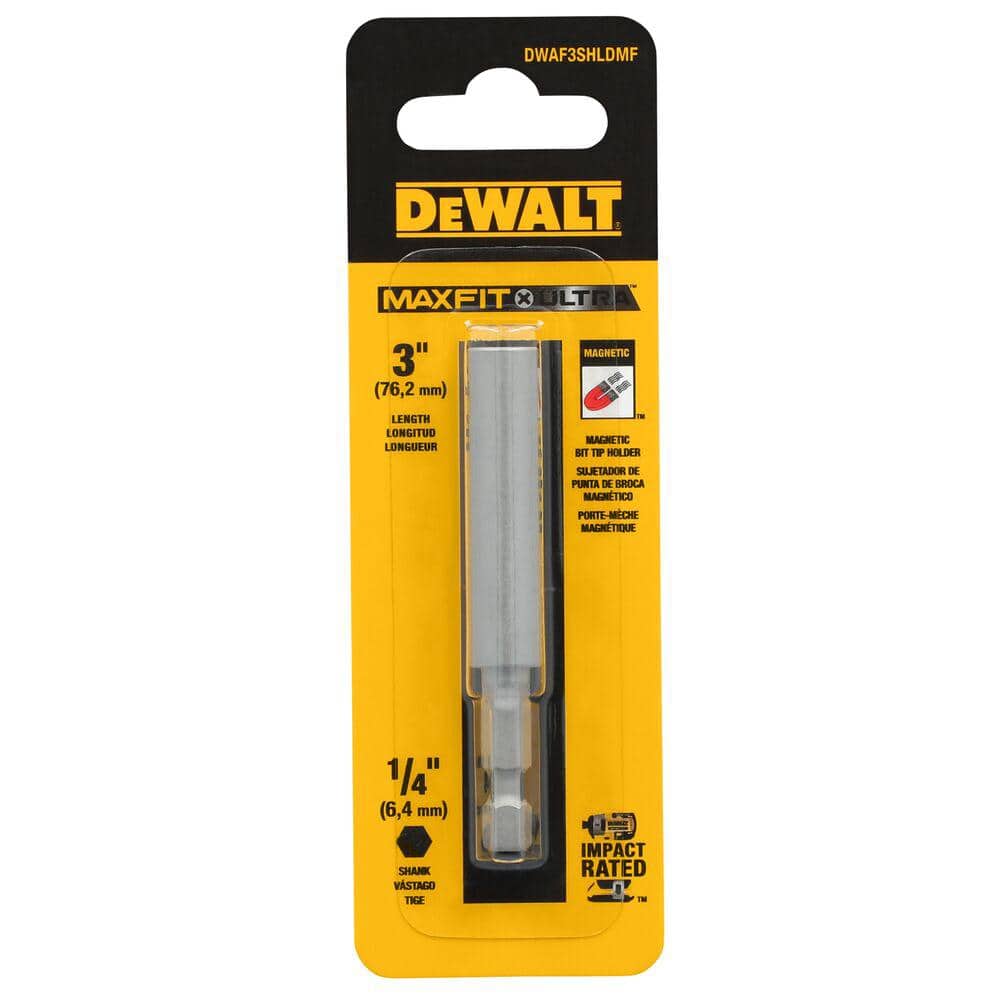 The DEWALT MAXFIT ULTRA 3 in. magnetic bit holder secures driver bits for wobble-free fastening in drills and impact drivers. Its 1/4 in. hex shank is impact rated, providing a firm hold and reliable performance for everyday fastening tasks.