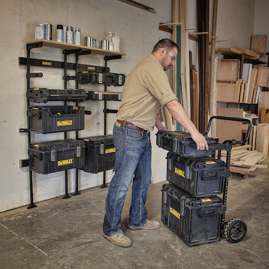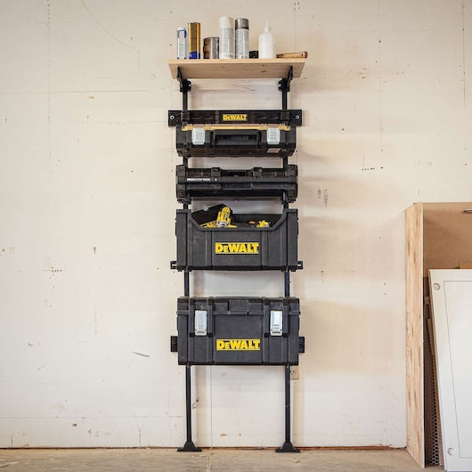 A modular wall-mounted racking system designed to organize DEWALT TOUGHSYSTEM tool boxes and modules. Flexible brackets and rails let you configure storage to fit your workshop and keep gear accessible.
