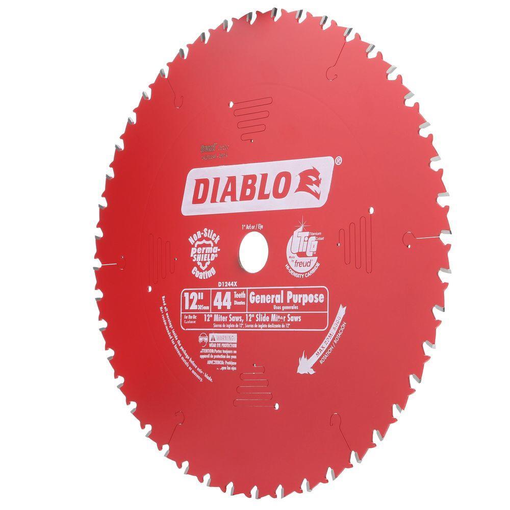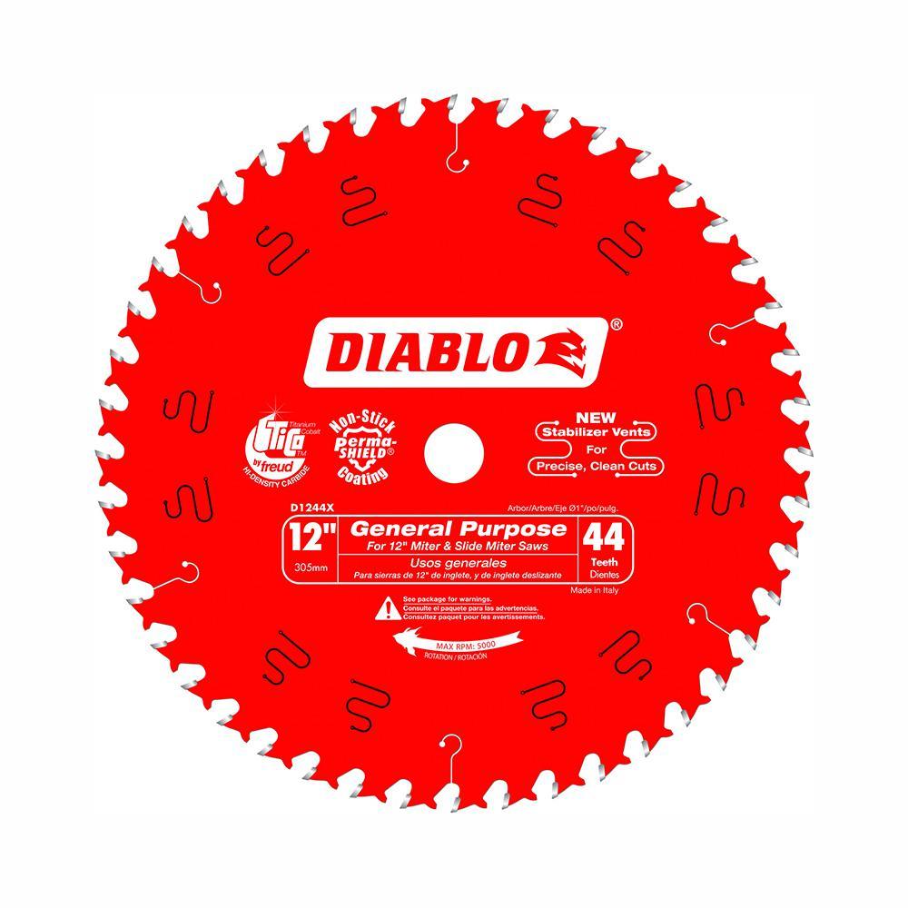 Diablo's next generation 12 in. x 44 Tooth General Purpose Carbide Circular Saw Blade features new laser-cut stabilizer vents for precise and clean cuts in a variety of wood materials. The advanced stabilizer vents feature a permanent filler baked in from top to bottom for absorbing noise and preventing sideways movement, allowing the blade to slice through wood cleanly, quickly and accurately. Constructed with TiCo Hi-Density special-blend carbide, Diablo's 12 in. general purpose blade produces razor sharp cuts and provides 5X longer cutting life. The laser cut heat expansion slots allow the blade to expand and contract during use, keeping the cut true and straight. This blade is excellent when working on projects such as decking, framing and building furniture.
